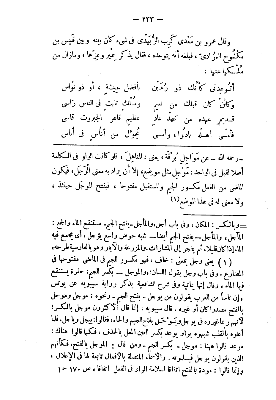 - رَحِمَهُ اللهُ- عَنْ مَوَاجِلِ بُرْقَةَ، يَعْنِي: الْمَنَاهِلَ، فَلَوْ كَانَتْ الْوَاوُ فِي الْكَلِمَةِ أَصْلًا لَقِيلَ فِي الْوَاحِدِ: مَوْجِلٌ مِثْلُ مَوْضِعٍ، إلّا أَنْ يُرَادَ بِهِ مَعْنَى الْوَجَلِ، فَيَكُونُ الْمَاضِي مِنْ الْفِعْلِ مَكْسُورَ الْجِيمِ وَالْمُسْتَقْبَلُ مَفْتُوحًا، فَيُفْتَحُ الْمَوْجَلُ حِينَئِذٍ، وَلَا مَعْنَى لَهُ فِي هَذَا الْمَوْضِعِ «1»
