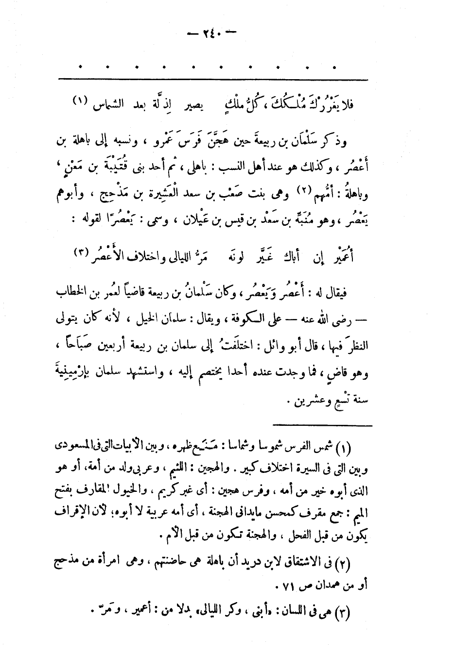 وَذَكَرَ سَلْمَانُ بْنُ رَبِيعَةَ حِينَ هَجَنَ فَرَسَ عَمْرٍو، وَنَسَبَهُ إلَى بَاهِلَةَ بْنِ أَعْصُرَ، وَكَذَلِكَ هُوَ عِنْدَ أَهْلِ النّسَبِ: بَاهِلِيّ، ثُمّ أَحَدُ بَنِي قُتَيْبَةَ بْنِ مَعْنٍ، وَبَاهِلَةُ: أُمّهُمْ «2» وَهِيَ بِنْتُ صَعْبِ بْنِ سَعْدِ الْعَشِيرَةِ بْنِ مَذْحِجَ، وَأَبُوهُمْ يَعْصُرُ، وَهُوَ مُنَبّهُ بْنُ سعد بن قيس بن عيلان، وسمى: يعصرا لِقَوْلِهِ: