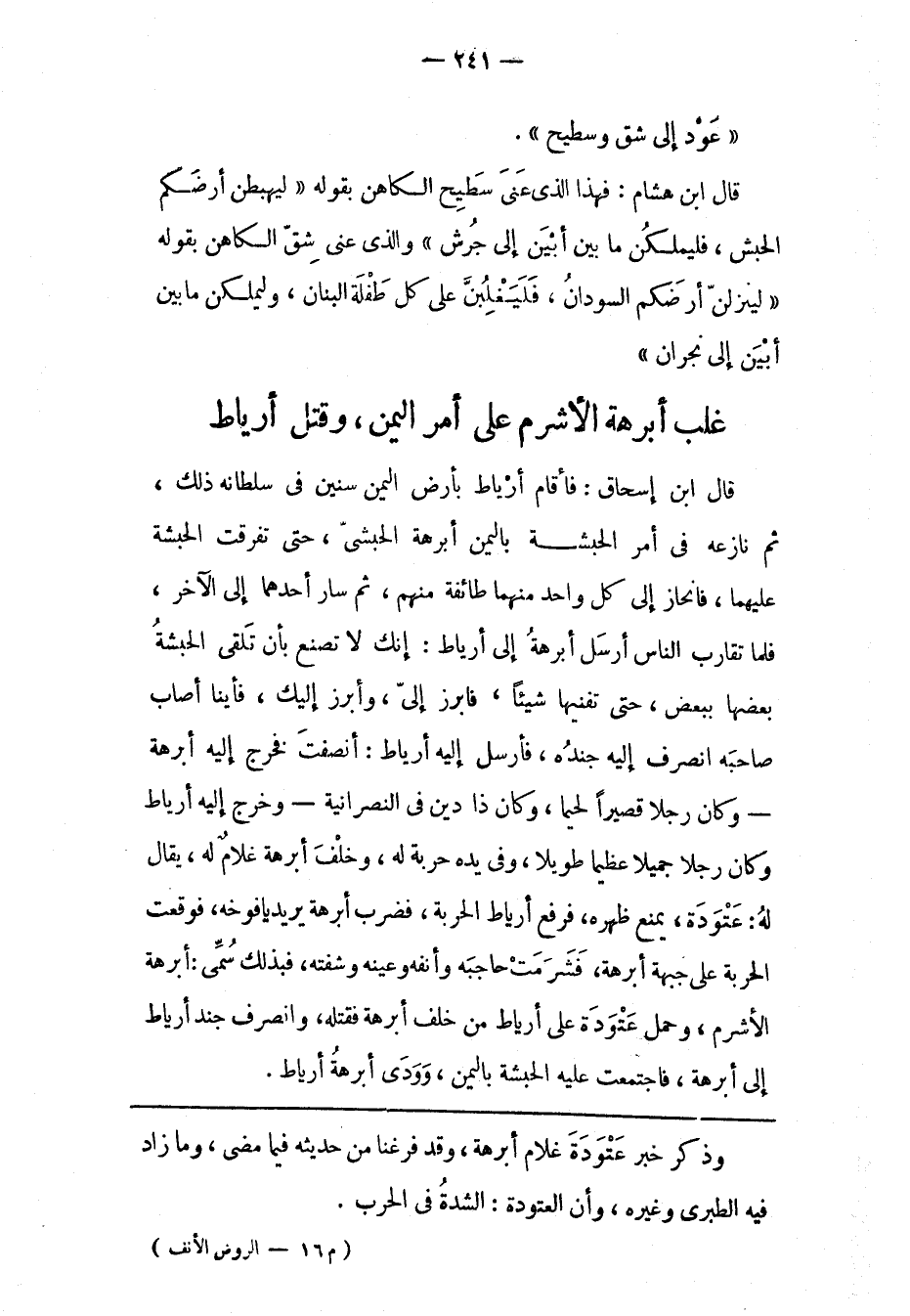قَالَ ابْنُ إسْحَاقَ: فَأَقَامَ أَرْيَاط بِأَرْضِ الْيَمَنِ سنين فى سلطانه ذلك، ثم نازعه فى أمر الحبشة باليمن أبرهة الحبشىّ، حَتّى تَفَرّقَتْ الْحَبَشَةُ عَلَيْهِمَا، فَانْحَازَ إلَى كُلّ وَاحِدٍ مِنْهُمَا طَائِفَةٌ مِنْهُمْ، ثُمّ سَارَ أَحَدُهُمَا إلَى الْآخَرِ، فَلَمّا تَقَارَبَ النّاسُ أَرْسَلَ أَبْرَهَةُ إلَى أَرْيَاط: إنّك لَا تَصْنَعُ بِأَنْ تَلْقَى الْحَبَشَةُ بَعْضُهَا بِبَعْضِ، حَتّى تَفِنِيهَا شَيْئًا، فَابْرُزْ إلَيّ، وَأَبْرُزُ إلَيْك، فَأَيّنَا أَصَابَ صَاحِبَهُ انْصَرَفَ إلَيْهِ جُنْدُهُ، فَأَرْسَلَ إلَيْهِ أَرْيَاط: أَنْصَفْتَ فَخَرَجَ إليه أبرهة- وكان رجلا قصيرا لحيما، وَكَانَ ذَا دِينٍ فِي النّصْرَانِيّةِ- وَخَرَجَ إلَيْهِ أَرْيَاط وَكَانَ رَجُلًا جَمِيلًا عَظِيمًا طَوِيلًا، وَفِي يَدِهِ حَرْبَةٌ لَهُ، وَخَلَفَ أَبْرَهَةَ غُلَامٌ لَهُ، يُقَالُ لَهُ: عَتَوْدَة، يَمْنَعُ ظَهْرَهُ، فَرَفَعَ أَرْيَاط الْحَرْبَةَ، فَضَرَبَ أَبْرَهَةَ يُرِيدُ يَافُوخَهُ، فَوَقَعَتْ الْحَرْبَةُ على جبهة أبرهة، فشرمت حاجبه وأنفه وَعَيْنَهُ وَشَفَتَهُ، فَبِذَلِكَ سُمّيَ: أَبْرَهَةَ الْأَشْرَمَ، وَحَمَلَ عَتَوْدَة عَلَى أَرْيَاط مِنْ خَلْفِ أَبْرَهَةَ فَقَتَلَهُ، وَانْصَرَفَ جُنْدُ أَرْيَاط إلَى أَبْرَهَةَ، فَاجْتَمَعَتْ عَلَيْهِ الحبشة باليمن، وودى أبرهة أرياط.