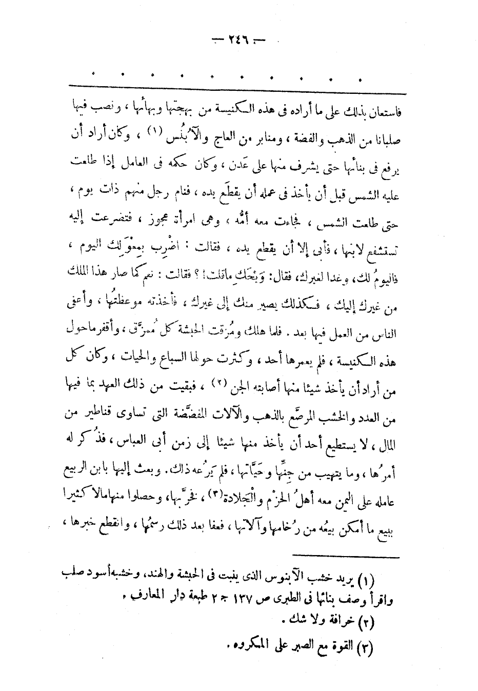 فَاسْتَعَانَ بِذَلِكَ عَلَى مَا أَرَادَهُ فِي هَذِهِ الْكَنِيسَةِ مِنْ بَهْجَتِهَا وَبِهَائِهَا، وَنَصَبَ فِيهَا صُلْبَانًا مِنْ الذّهَبِ وَالْفِضّةِ، وَمَنَابِرَ مِنْ الْعَاجِ وَالْآبُنُسِ «1» ، وَكَانَ أَرَادَ أَنْ يَرْفَعَ فِي بِنَائِهَا حَتّى يُشْرِفَ مِنْهَا عَلَى عَدَنَ، وَكَانَ حُكْمُهُ فِي الْعَامِلِ إذَا طَلَعَتْ عَلَيْهِ الشّمْسُ قَبْلَ أَنْ يَأْخُذَ فِي عَمَلِهِ أَنْ يَقْطَعَ يَدَهُ، فَنَامَ رَجُلٌ مِنْهُمْ ذَاتَ يَوْمٍ، حَتّى طَلَعَتْ الشّمْسُ، فَجَاءَتْ مَعَهُ أُمّهُ، وَهِيَ امْرَأَةٌ عَجُوزٌ، فَتَضَرّعَتْ إلَيْهِ تَسْتَشْفِعُ لِابْنِهَا، فَأَبَى إلّا أَنْ يَقْطَعَ يَدَهُ، فَقَالَتْ: اضْرِبْ بِمِعْوَلِك الْيَوْمَ، فَالْيَوْمُ لَك، وَغَدًا لِغَيْرِك، فَقَالَ: وَيْحَك مَا قُلْت!؟ فَقَالَتْ: نَعَمْ كَمَا صَارَ هَذَا الْمُلْكُ مِنْ غَيْرِك إلَيْك، فَكَذَلِكَ يَصِيرُ مِنْك إلَى غَيْرِك، فَأَخَذَتْهُ مَوْعِظَتُهَا، وَأَعْفَى النّاسَ مِنْ الْعَمَلِ فِيهَا بَعْدُ. فَلَمّا هَلَكَ وَمُزّقَتْ الْحَبَشَةُ كُلّ مُمَزّقٍ، وَأُقْفِرَ مَا حَوْلَ هَذِهِ الْكَنِيسَةِ، فَلَمْ يَعْمُرْهَا أَحَدٌ، وَكَثُرَتْ حَوْلَهَا السّبَاعُ وَالْحَيّاتُ، وَكَانَ كُلّ مَنْ أَرَادَ أَنْ يَأْخُذَ شَيْئًا مِنْهَا أَصَابَتْهُ الْجِنّ «2» ، فَبَقِيَتْ مِنْ ذَلِكَ الْعَهْدِ بِمَا فِيهَا مِنْ الْعُدَدِ وَالْخَشَبِ الْمُرَصّعِ بِالذّهَبِ وَالْآلَاتِ الْمُفَضّضَةِ الّتِي تُسَاوِي قَنَاطِيرَ مِنْ الْمَالِ، لَا يَسْتَطِيعُ أَحَدٌ أَنْ يَأْخُذَ مِنْهَا شَيْئًا إلَى زَمَنِ أَبِي الْعَبّاسِ، فَذُكِرَ لَهُ أَمْرُهَا، وَمَا يُتَهَيّبُ مِنْ جِنّهَا وَحَيّاتِهَا، فَلَمْ يَرُعْهُ ذَلِكَ. وَبَعَثَ إلَيْهَا بِابْنِ الرّبِيعِ عَامِلِهِ عَلَى الْيَمَنِ مَعَهُ أَهْلُ الْحَزْمِ وَالْجَلَادَةِ «3» ، فَخَرّبَهَا، وَحَصَلُوا مِنْهَا مَالًا كَثِيرًا بِبَيْعِ مَا أَمْكَنَ بَيْعُهُ مِنْ رُخَامِهَا وَآلَاتِهَا، فعفا بعد ذلك رسمها، وانقطع خبرها،