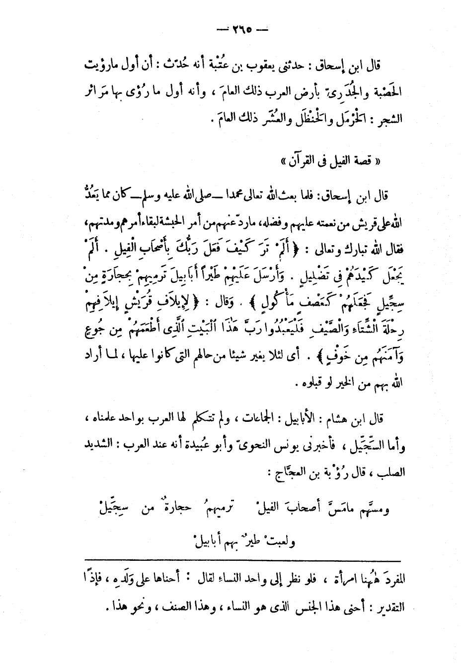 قَالَ ابْنُ هِشَامٍ: الْأَبَابِيلُ: الْجَمَاعَاتُ، وَلَمْ تَتَكَلّمْ لَهَا الْعَرَبُ بِوَاحِدِ عَلِمْنَاهُ، وَأَمّا السّجّيلُ، فَأَخْبَرَنِي يُونُسُ النّحْوِيّ وَأَبُو عُبَيْدَةَ أَنّهُ عِنْدَ الْعَرَبِ: الشّدِيدُ الصّلْبُ، قَالَ رُؤْبَةُ بْنُ الْعَجّاجِ: