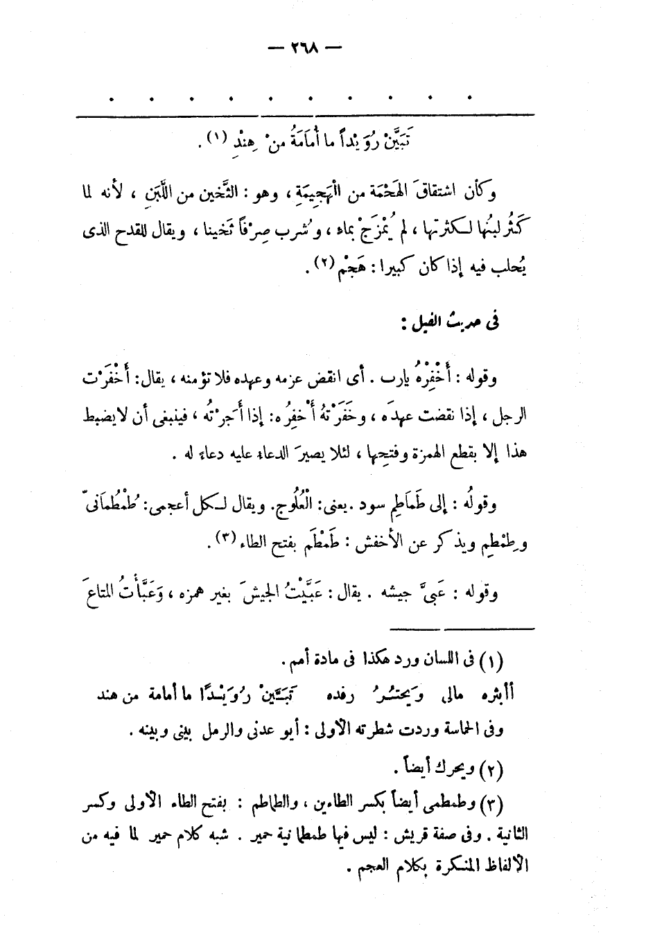 (3) وطمطمى أيضا بكسر الطاءين، والطماطم: بفتح الطاء الأولى وكسر الثانية. وفى صفة قريش: ليس فيها طمطمانية حمير. شبه كلام حمير لما فيه من الألفاظ المنكرة بكلام العجم.