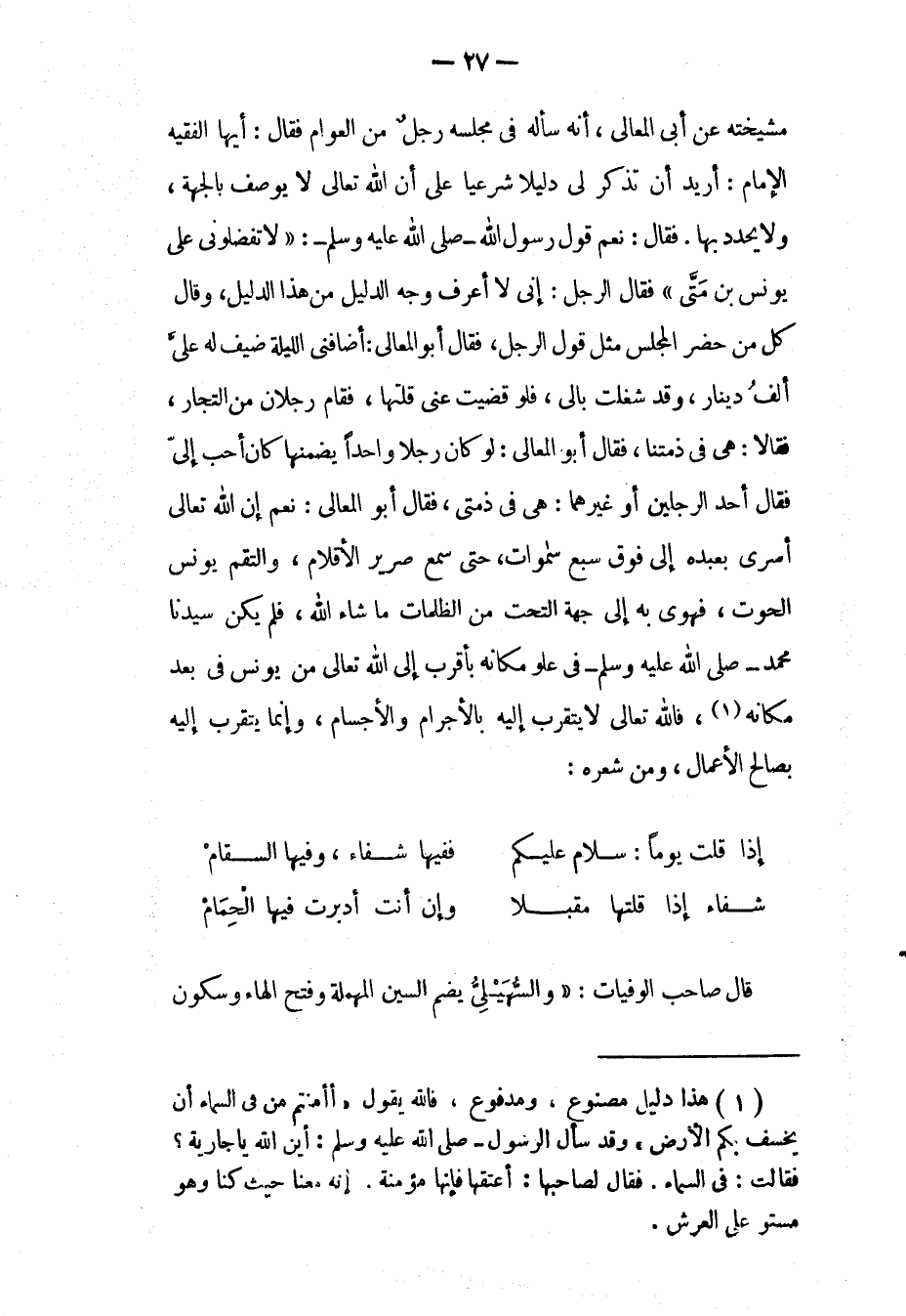 مشيخته عن أبى المعالى، أنه سأله فى مجلسه رجل من العوام فقال: أيها الفقيه الإمام: أريد أن تذكر لى دليلا شرعيا على أن الله تعالى لا يوصف بالجهة، ولا يحدد بها. فقال: نعم قول رسول الله- صلى الله عليه وسلم-: «لا تفضلونى على يونس بن متّى» فقال الرجل: إنى لا أعرف وجه الدليل من هذا الدليل، وقال كل من حضر المجلس مثل قول الرجل، فقال أبو المعالى: أضافنى الليلة ضيف له علىّ ألف دينار، وقد شغلت بالى، فلو قضيت عنى قلتها، فقام رجلان من التجار، فقالا: هى فى ذمتنا، فقال أبو المعالى: لو كان رجلا واحدا يضمنها كان أحب إلىّ فقال أحد الرجلين أو غيرهما: هى فى ذمتى، فقال أبو المعالى: نعم إن الله تعالى أسرى بعبده إلى فوق سبع سموات، حتى سمع صرير الأقلام، والتقم يونس الحوت، فهوى به إلى جهة التحت من الظلمات ما شاء الله، فلم يكن سيدنا محمد- صلى الله عليه وسلم- فى علو مكانه بأقرب إلى الله تعالى من يونس فى بعد مكانه «1» ، فالله تعالى لا يتقرب إليه بالأجرام والأجسام، وإنما يتقرب إليه بصالح الأعمال، ومن شعره: