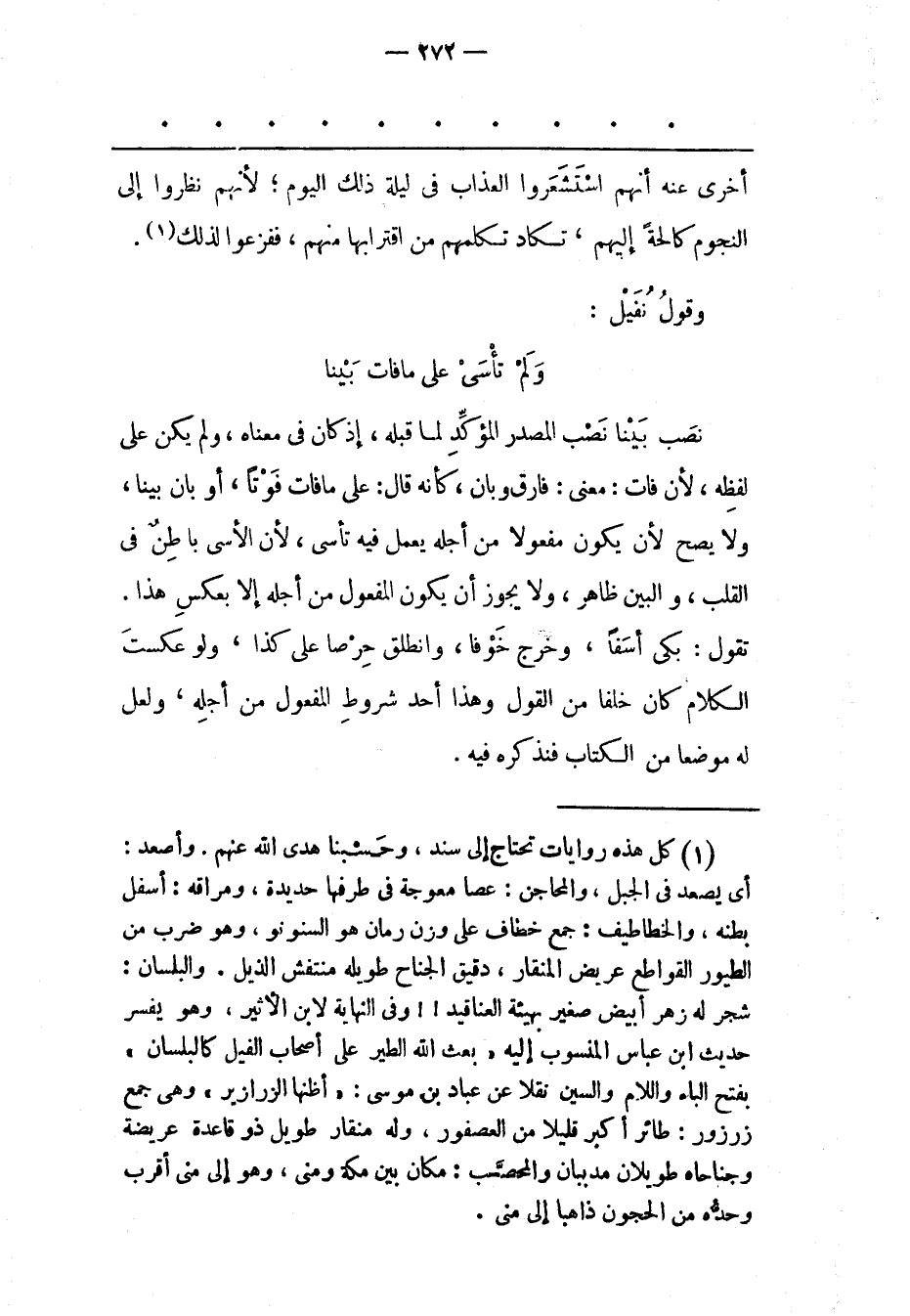 (1) كل هذه روايات تحتاج إلى سند، وحسبنا هدى الله عنهم. وأصعد: أى يصعد فى الجبل، والمحاجن: عصا معوجة فى طرفها حديدة، ومراقه: أسفل بطنه، والخطاطيف: جمع خطاف على وزن رمان هو السنونو، وهو ضرب من الطيور القواطع عريض المنقار، دقيق الجناح طويله منتفش الذيل. والبلسان: شجر له زهر أبيض صغير بهيئة العناقيد!! وفى النهاية لابن الأثير، وهو يفسر حديث ابن عباس المنسوب إليه «بعث الله الطير على أصحاب الفيل كالبلسان» بفتح الباء واللام والسين نقلا عن عباد بن موسى: «أظنها الزرازير» وهى جمع زرزور: طائر أكبر قليلا من العصفور، وله منقار طويل ذو قاعدة عريضة وجناحاه طويلان مدببان والمحصّب: مكان بين مكة ومنى، وهو إلى منى أقرب وحدّه من الحجون ذاهبا إلى منى.