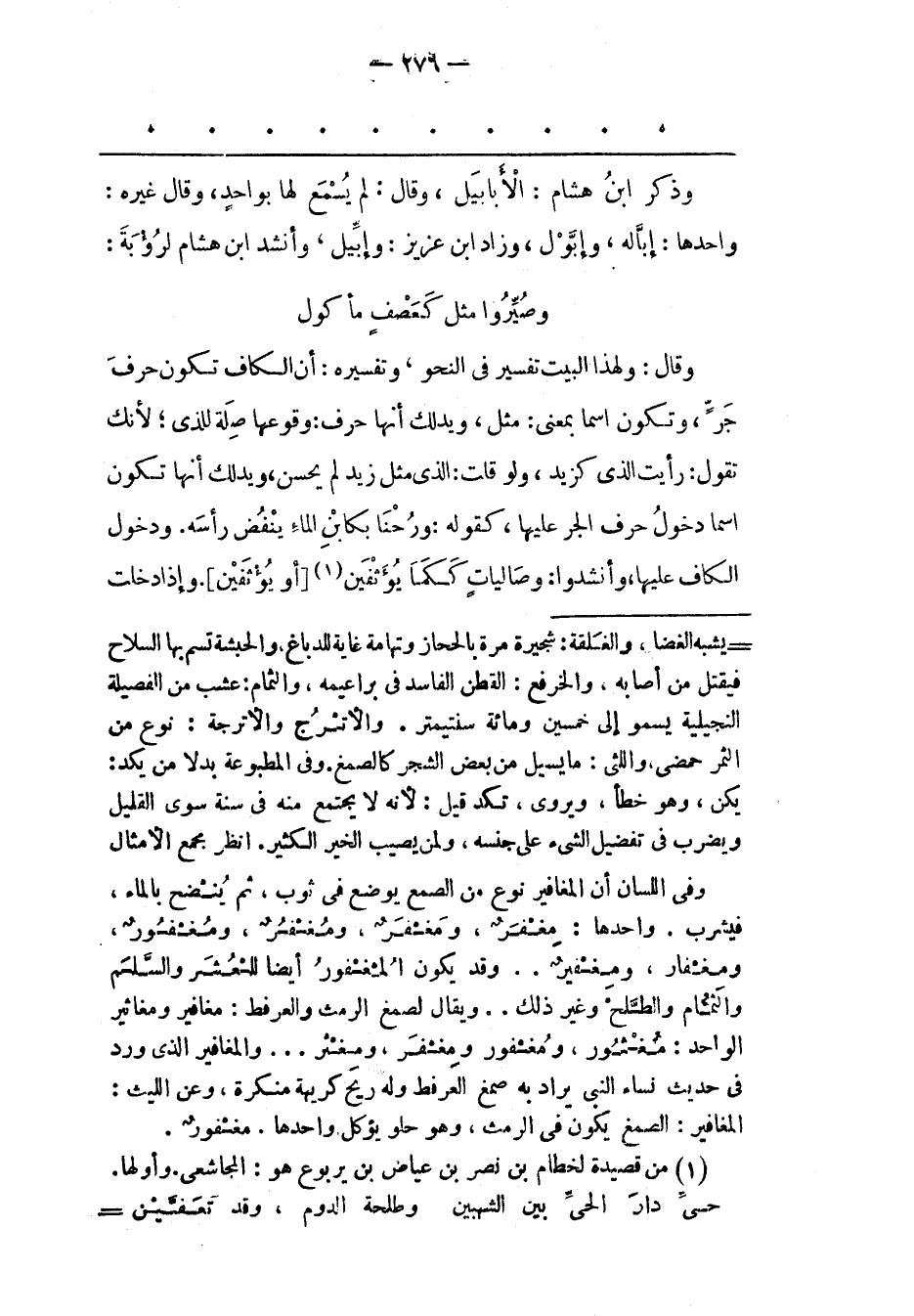 - يشبه الغضا، والغلقة: شجيرة مرة بالحجاز وتهامة غاية للدباغ، والحبشة تسم بها السلاح فيقتل من أصابه، والخرفع: القطن الفاسد فى براعيمه، والثمام: عشب من الفصيلة النجيلية يسمو إلى خمسين ومائة سنتيمتر. والأترج والأترجة: نوع من الثمر حمضى، واللثى: ما يسيل من بعض الشجر كالصمغ. وفى المطبوعة بدلا من يكد: يكن، وهو خطأ، ويروى، تكد قيل: لأنه لا يجتمع منه فى سنة سوى القليل ويضرب فى تفضيل الشئ على جنسه، ولمن يصيب الخير الكثير. انظر مجمع الأمثال وفى اللسان أن المغافير نوع من الصمع يوضع فى ثوب، ثم ينضح بالماء، فيشرب. واحدها: مغفر، ومغفر، ومغفر، ومغفور، ومغفار، ومغفير.. وقد يكون المغفور أيضا للعشر والسّلم والثمّام والطّلح وغير ذلك.. ويقال لصمغ الرمث والعرفط: مغافير ومغاثير الواحد: مغثور، ومغفور ومغفر، ومغثر ... والمغافير الذى ورد فى حديث نساء النبى يراد به صمغ العرفط وله ريح كريهة منكرة، وعن الليث: المغافير: الصمغ يكون فى الرمث، وهو حلو يؤكل واحدها. مغفور.