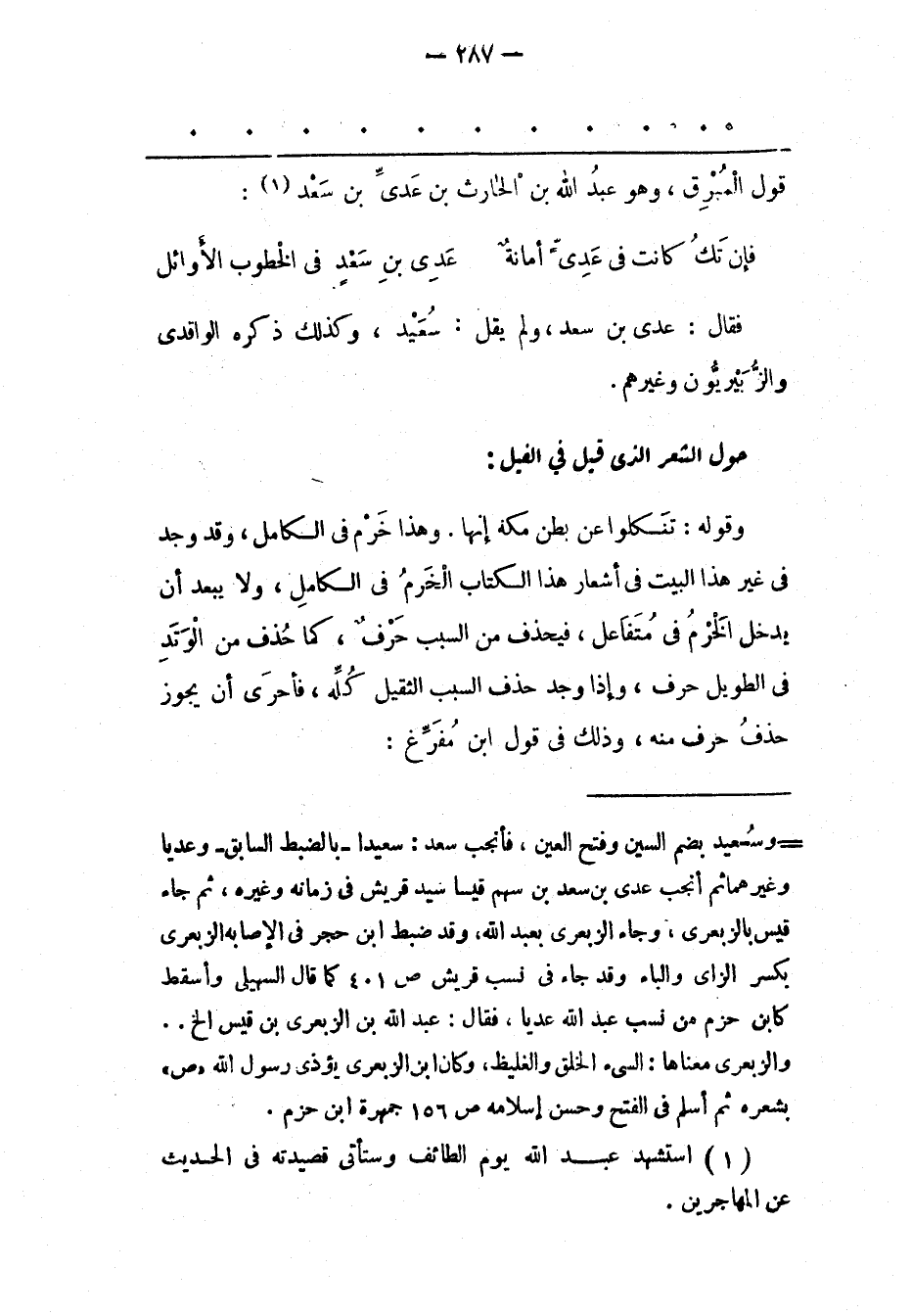 - وسعيد بضم السين وفتح العين، فأنجب سعد: سعيدا- بالضبط السابق- وعديا وغيرهما ثم أنجب عدى بن سعد بن سهم قيسا سيد قريش فى زمانه وغيره، ثم جاء قيس بالزبعرى، وجاء الزبعرى بعبد الله، وقد ضبط ابن حجر فى الإصابه الزبعرى بكسر الزاى والباء وقد جاء فى نسب قريش ص 401 كما قال السهيلى وأسقط كابن حزم من نسب عبد الله عديا، فقال: عبد الله بن الزبعرى بن قيس الخ.. والزبعرى معناها: السئ الخلق والغليظ، وكان ابن الزبعرى يؤذى رسول الله «ص» بشعره ثم أسلم فى الفتح وحسن إسلامه ص 156 جمهرة ابن حزم.