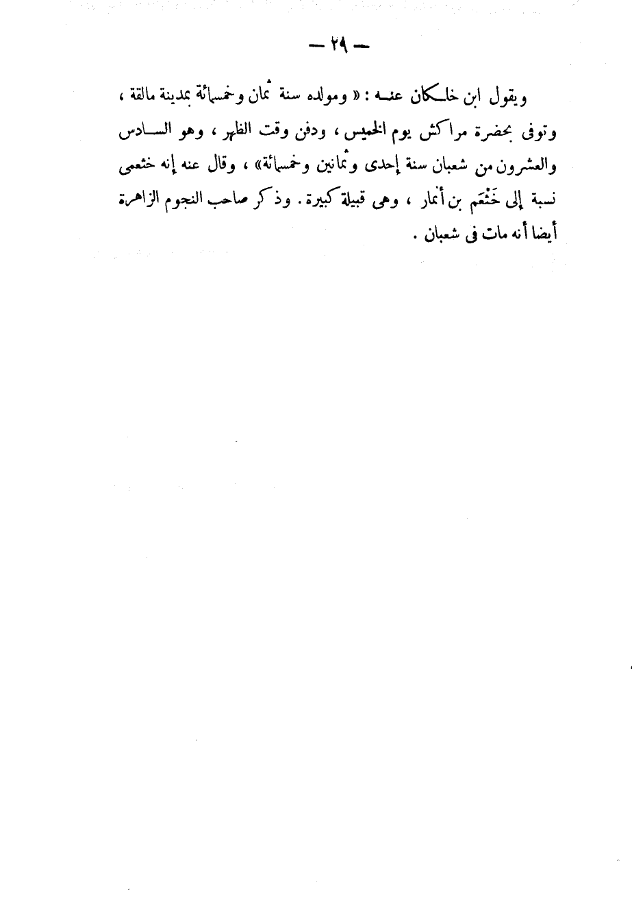 ويقول ابن خلكان عنه: «ومولده سنة ثمان وخمسمائة بمدينة مالقة، وتوفى بحضرة مراكش يوم الخميس، ودفن وقت الظهر، وهو السادس والعشرون من شعبان سنة إحدى وثمانين وخمسمائة» ، وقال عنه إنه خثعمى نسبة إلى خثعم بن أنمار، وهى قبيلة كبيرة. وذكر صاحب النجوم الزاهرة أيضا أنه مات فى شعبان.