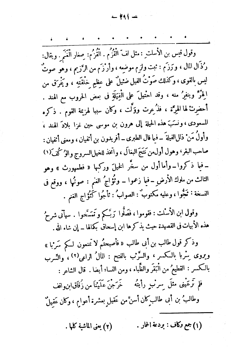 وَذَكَرَ قَوْلَ طَالِبِ بْنِ أَبِي طَالِبٍ «فَأَصْبَحْتُمْ لَا تَمْنَعُونَ لَكُمْ سَرْبًا» وَيُرْوَى سِرْبًا بِالْكَسْرِ، وَالسّرْبُ بِالْفَتْحِ: الْمَالُ الرّاعِي «2» ، وَالسّرْبُ بِالْكَسْرِ: الْقَطِيعُ مِنْ الْبَقَرِ وَالظّبَاءِ، وَمِنْ النّسَاءِ أيضا. قال الشاعر: