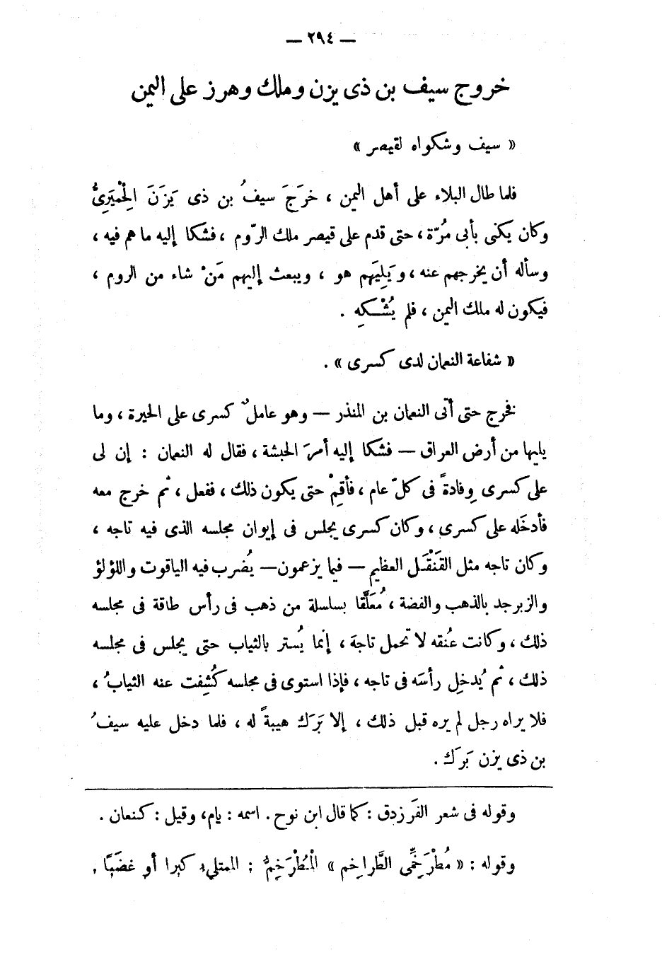 فَخَرَجَ حَتّى أَتَى النّعْمَانَ بْنَ الْمُنْذِرِ- وَهُوَ عَامِلُ كِسْرَى عَلَى الْحِيرَةِ، وَمَا يَلِيهَا مِنْ أَرْضِ الْعِرَاقِ- فَشَكَا إلَيْهِ أَمْرَ الْحَبَشَةِ، فَقَالَ لَهُ النّعْمَانُ: إنّ لِي عَلَى كِسْرَى وِفَادَةً فِي كُلّ عَامٍ، فَأَقِمْ حَتّى يَكُونَ ذَلِكَ، فَفَعَلَ، ثُمّ خَرَجَ مَعَهُ فَأَدْخَلَهُ عَلَى كِسْرَى، وَكَانَ كِسْرَى يَجْلِسُ فِي إيوَانِ مَجْلِسِهِ الّذِي فِيهِ تَاجُهُ، وَكَانَ تَاجُهُ مِثْلَ القَنْقل الْعَظِيمِ- فِيمَا يَزْعُمُونَ- يُضْرَبُ فِيهِ الْيَاقُوتُ وَاللّؤْلُؤُ وَالزّبَرْجَدُ بِالذّهَبِ وَالْفِضّةِ، مُعَلّقًا بِسَلْسَلَةِ مِنْ ذَهَبٍ فِي رَأْسِ طَاقَةٍ فِي مَجْلِسِهِ ذَلِكَ، وَكَانَتْ عُنُقُهُ لَا تَحْمِلُ تَاجَهُ، إنّمَا يُسْتَرُ بِالثّيَابِ حَتّى يَجْلِسَ فِي مَجْلِسِهِ ذَلِكَ، ثُمّ يُدْخِلُ رَأْسَهُ فِي تَاجِهِ، فَإِذَا اسْتَوَى فِي مَجْلِسِهِ كُشِفَتْ عَنْهُ الثّيَابُ، فَلَا يَرَاهُ رَجُلٌ لم يره قبل ذلك، إلا برك هيبة له، فلما دَخَلَ عَلَيْهِ سَيْفُ بْنُ ذِي يَزَنَ بَرَكَ.