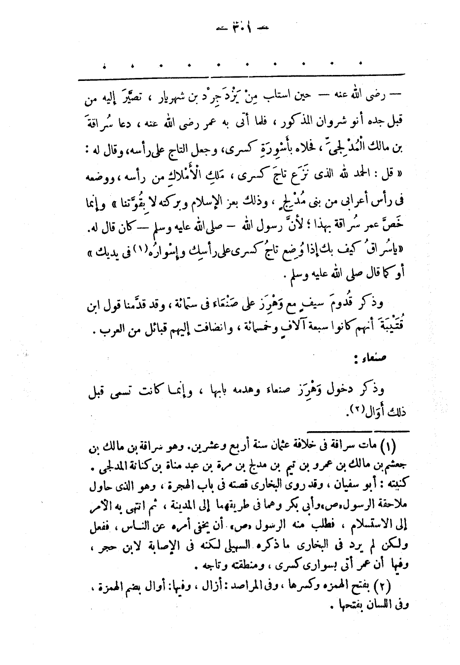 (1) مات سراقة فى خلافة عثمان سنة أربع وعشرين. وهو سراقة بن مالك بن جعشم بن مالك بن عمرو بن تيم بن مدلج بن مرة بن عبد مناة بن كنانة المدلجى. كنيته: أبو سفيان، وقد روى البخارى قصته فى باب الهجرة، وهو الذى حاول ملاحقة الرسول «ص» وأبى بكر وهما فى طريقهما إلى المدينة، ثم انتهى به الأمر إلى الاستسلام، فطلب منه الرسول «ص» أن يخفى أمره عن الناس، ففعل ولكن لم يرد فى البخارى ما ذكره السهيلى لكنه فى الإصابة لابن حجر، وفيها أن عمر أتى بسوارى كسرى، ومنطقته وتاجه.