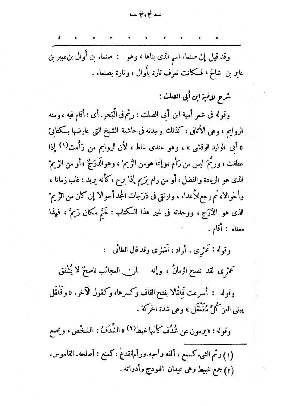 وقوله فى شعر أمية ابن أَبِي الصّلْتِ: رَيّمَ فِي الْبَحْرِ. أَيْ: أَقَامَ فِيهِ، وَمِنْهُ الرّوَايِمُ، وَهِيَ الْأَثَافِي، كَذَلِكَ وَجَدْته فِي حَاشِيَة الشّيْخِ الّتِي عَارَضَهَا بِكِتَابَيْ «أَبِي الْوَلِيدِ الْوَقْشِيّ» ، وَهُوَ عِنْدِي غَلَطٍ، لِأَنّ الرّوَايِمَ مِنْ رَأَمَتْ «1» إذَا عَطَفَتْ، وَرَيّمَ لَيْسَ مِنْ رَأَمَ، وَإِنّمَا هُوَ مِنْ الرّيْمِ، وَهُوَ الدّرَجُ، أَوْ مِنْ الرّيْمِ الّذِي هُوَ الزّيَادَةُ وَالْفَضْلُ، أَوْ مِنْ رَامَ يَرِيمُ إذَا بَرِحَ، كَأَنّهُ يُرِيدُ: غَابَ زَمَانًا، وَأَحْوَالًا، ثُمّ رَجَعَ لِلْأَعْدَاءِ، وَارْتَقَى فِي دَرَجَاتِ الْمَجْدِ أَحْوَالًا إنْ كَانَ مِنْ الرّيْمِ الّذِي هُوَ الدّرْجُ، وَوَجَدْته فِي غَيْرِ هَذَا الْكِتَابِ: خَيّمَ مَكَانَ رَيّمَ، فَهَذَا مَعْنَاهُ: أَقَامَ.