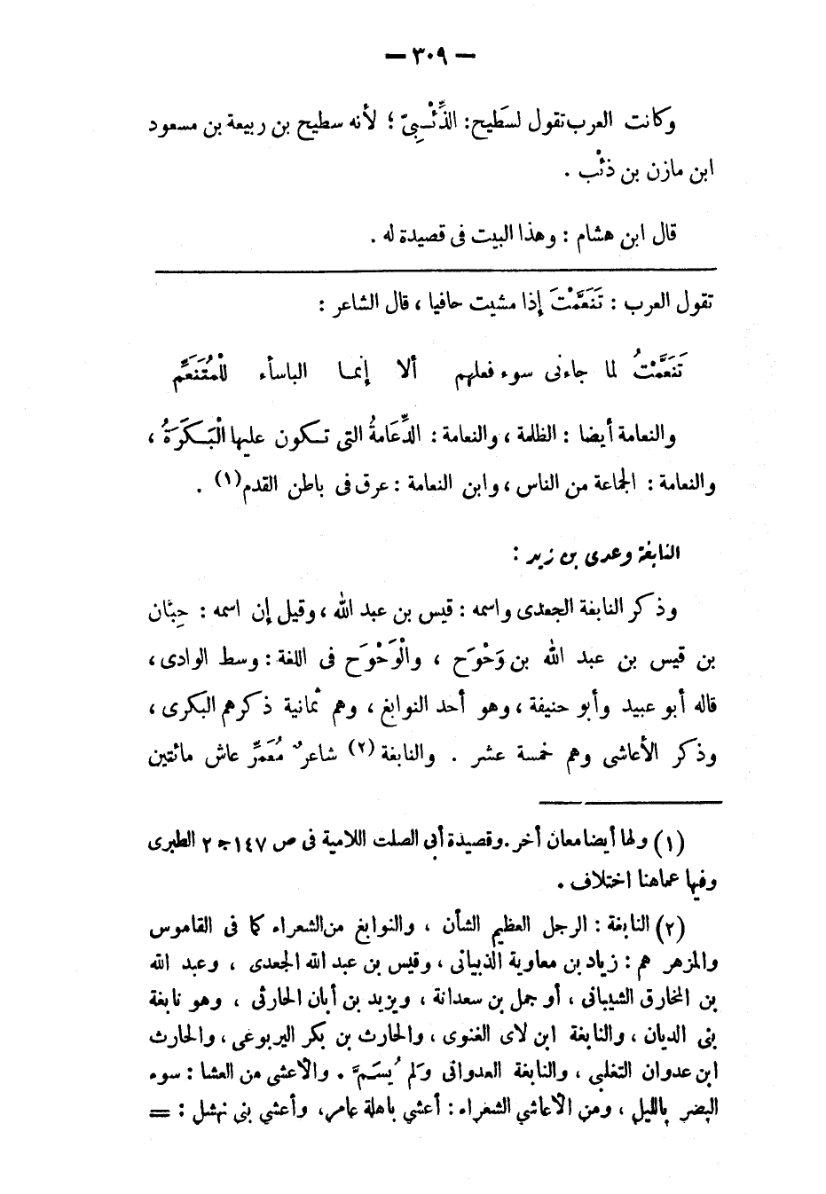 (2) النابغة: الرجل العظيم الشأن، والنوابغ من الشعراء كما فى القاموس والمزهر هم: زياد بن معاوية الذبيانى، وقيس بن عبد الله الجعدى، وعبد الله بن المخارق الشيبانى، أو جمل بن سعدانة، ويزيد بن أبان الحارثى، وهو نابغة بنى الديان، والنابغة ابن لاى الغنوى، والحارث بن بكر اليربوعى، والحارث ابن عدوان التغلبى، والنابغة العدوانى ولم يسمّ. والأعشى من العشا: سوء البصر بالليل، ومن الأعاشى الشعراء: أعشى باهلة عامر، وأعشى بنى نهشل: -
