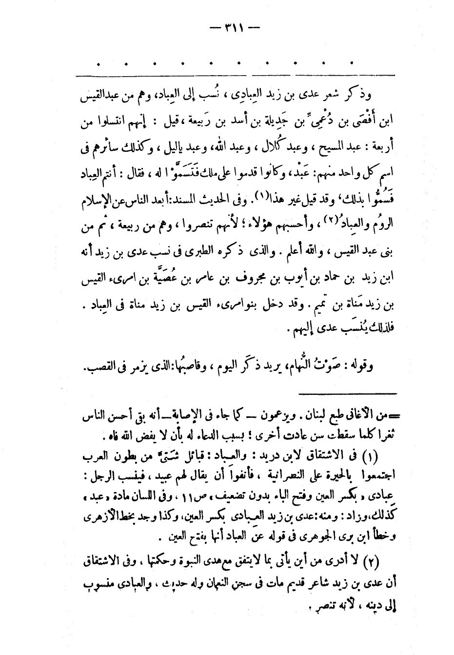 (2) لا ادرى من أين يأتى بما لا يتفق مع هدى النبوة وحكمتها، وفى الاشتقاق أن عدى بن زيد شاعر قديم مات فى سجن النعمان وله حديث، والعبادى منسوب إلى دينه، لأنه تنصر.