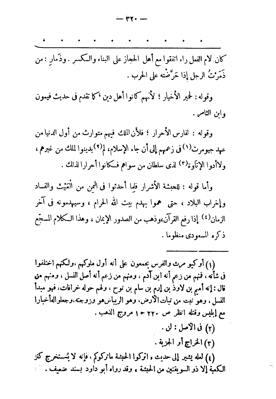 وَأَمّا قَوْلُهُ: لِلْحَبَشَةِ الْأَشْرَارُ فَلَمّا أَحْدَثُوا فِي الْيَمَنِ مِنْ الْعَيْثِ وَالْفَسَادِ وَإِخْرَابِ الْبِلَادِ، حَتّى هَمّوا بِهَدْمِ بَيْتِ اللهِ الْحَرَامِ، وَسَيَهْدِمُونَهُ فِي آخِرِ الزّمَانِ «4» إذَا رَفَعَ الْقُرْآنَ، وَذَهَبَ مِنْ الصّدُورِ الْإِيمَانُ، وَهَذَا الكلام المسجّع ذكره المسعودى منظوما.
