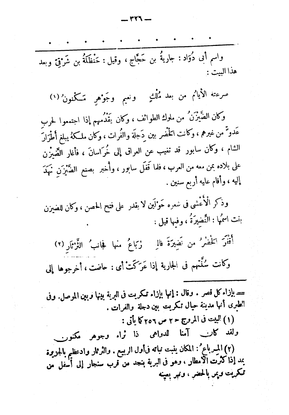 (2) المرباع: المكان ينبت نباته فى أول الربيع. والثرثار واد عظيم بالجزيرة يمد إذا كثرت الأمطار، وهو فى البرية بنجد من قرب سنجار إلى أسفل من تكريت ويمر بالحضر، ونهر بعينه