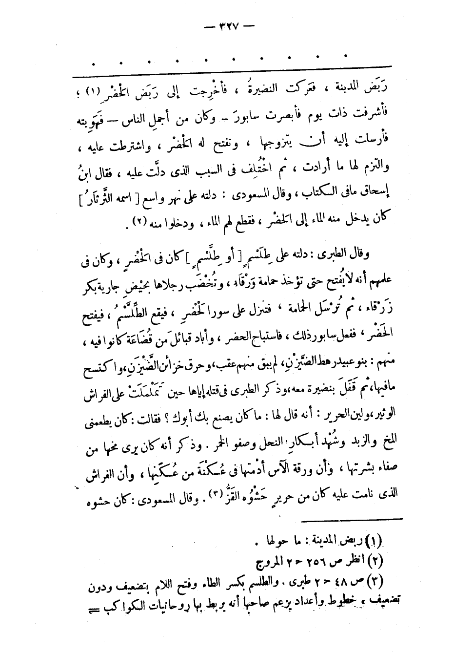 رَبَضِ الْمَدِينَةِ، فَعَرَكَتْ النّضِيرَةُ، فَأُخْرِجَتْ إلَى رَبَضِ الْحَضْرِ «1» ؛ فَأَشْرَفَتْ ذَاتَ يَوْمٍ فَأَبْصَرَتْ سَابُورَ- وَكَانَ مِنْ أَجْمَلِ النّاسِ- فَهَوِيَتْهُ فَأَرْسَلَتْ إلَيْهِ أَنْ يَتَزَوّجَهَا، وَتَفْتَحَ لَهُ الْحَضْرَ، وَاشْتَرَطَتْ عَلَيْهِ، وَالْتَزَمَ لَهَا مَا أَرَادَتْ، ثُمّ اُخْتُلِفَ فِي السّبَبِ الّذِي دَلّتْ عَلَيْهِ، فَقَالَ ابْنُ إسْحَاقَ مَا فِي الْكِتَابِ، وَقَالَ الْمَسْعُودِيّ: دَلّتْهُ عَلَى نَهَرٍ وَاسِعٍ [اسْمُهُ الثّرْثَارُ] كَانَ يَدْخُلُ مِنْهُ الْمَاءُ إلَى الْحَضْرِ، فَقَطَعَ لَهُمْ الْمَاءَ، وَدَخَلُوا مِنْهُ «2» .