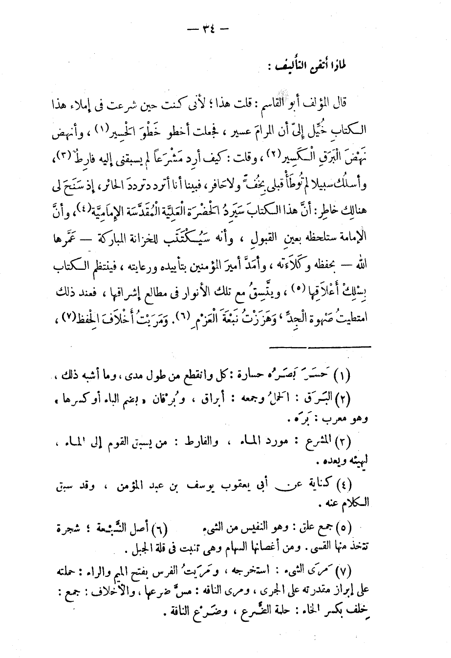 قَالَ الْمُؤَلّفُ أَبُو الْقَاسِمِ: قُلْت هَذَا؛ لِأَنّي كُنْت حِينَ شَرَعْت فِي إمْلَاءِ هَذَا الْكِتَابِ خُيّلَ إلَيّ أَنّ الْمَرَامَ عَسِيرٌ، فَجَعَلْت أَخْطُو خَطْوَ الْحَسِيرِ «1» ، وَأَنْهَضُ نَهْضَ الْبَرْقِ الْكَسِيرِ «2» ، وَقُلْت: كَيْفَ أَرِدُ مَشْرَعًا لَمْ يسبقنى إليه فارط «3» ، وأسلك سَبِيلًا لَمْ تُوطَأْ قَبْلِي بِخُفّ وَلَا حَافِرٍ، فبينا أنا أتردد تردد الحائر، إذ سنح لى هنا لك خَاطِرٌ: أَنّ هَذَا الْكِتَابَ سَيَرِدُ الْحَضْرَةَ الْعَلِيّةَ الْمُقَدّسَةَ الْإِمَامِيّةَ «4» ، وَأَنّ الْإِمَامَةَ سَتَلْحَظُهُ بِعَيْنِ الْقَبُولِ، وَأَنّهُ سَيُكْتَتَبُ لِلْخِزَانَةِ الْمُبَارَكَةِ- عَمّرَهَا اللهُ- بِحِفْظِهِ وَكِلَاءَتِهِ، وَأَمَدّ أَمِيرَ الْمُؤْمِنِينَ بِتَأْيِيدِهِ وَرِعَايَتِهِ، فَيَنْتَظِمُ الْكِتَابُ بِسَلْكِ أَعْلَاقِهَا «5» ، وَيَتّسِقُ مَعَ تِلْكَ الْأَنْوَارِ فى مطالع إشراقها، فَعِنْدَ ذَلِكَ امْتَطَيْت صَهْوَةَ الْجِدّ، وَهَزَزْت نَبْعَةَ العزم «6» . ومريت أخلاف الحفظ «7» ،