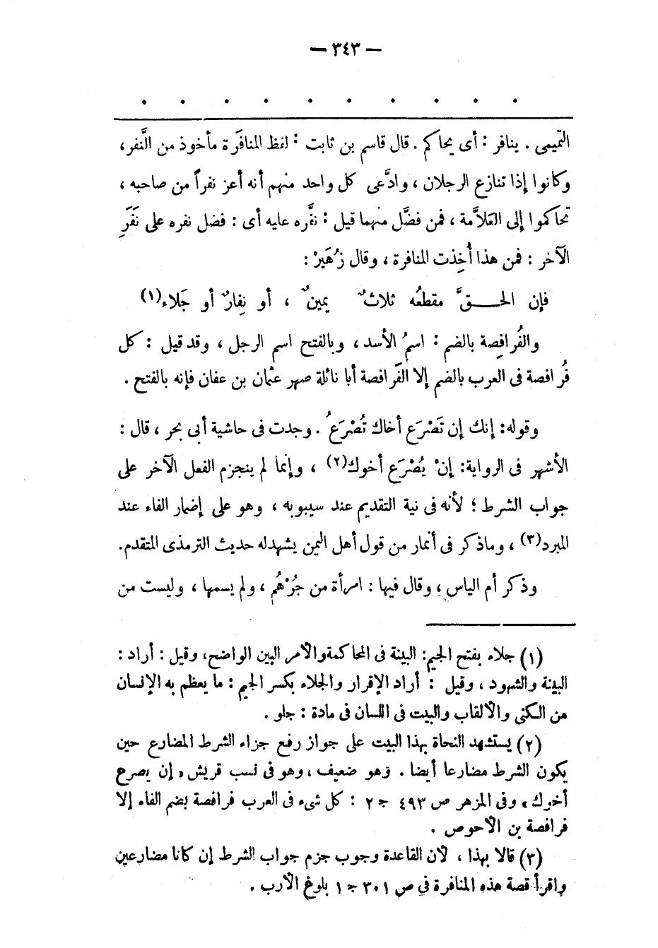 (1) جلاء بفتح الجيم: البينة فى المحاكمة والأمر البين الواضح، وقيل: أراد: البينة والشهود، وقيل: أراد الإقرار والجلاء بكسر الجيم: ما يعظم به الإنسان من الكنى والألقاب والبيت فى اللسان فى مادة: جلو.