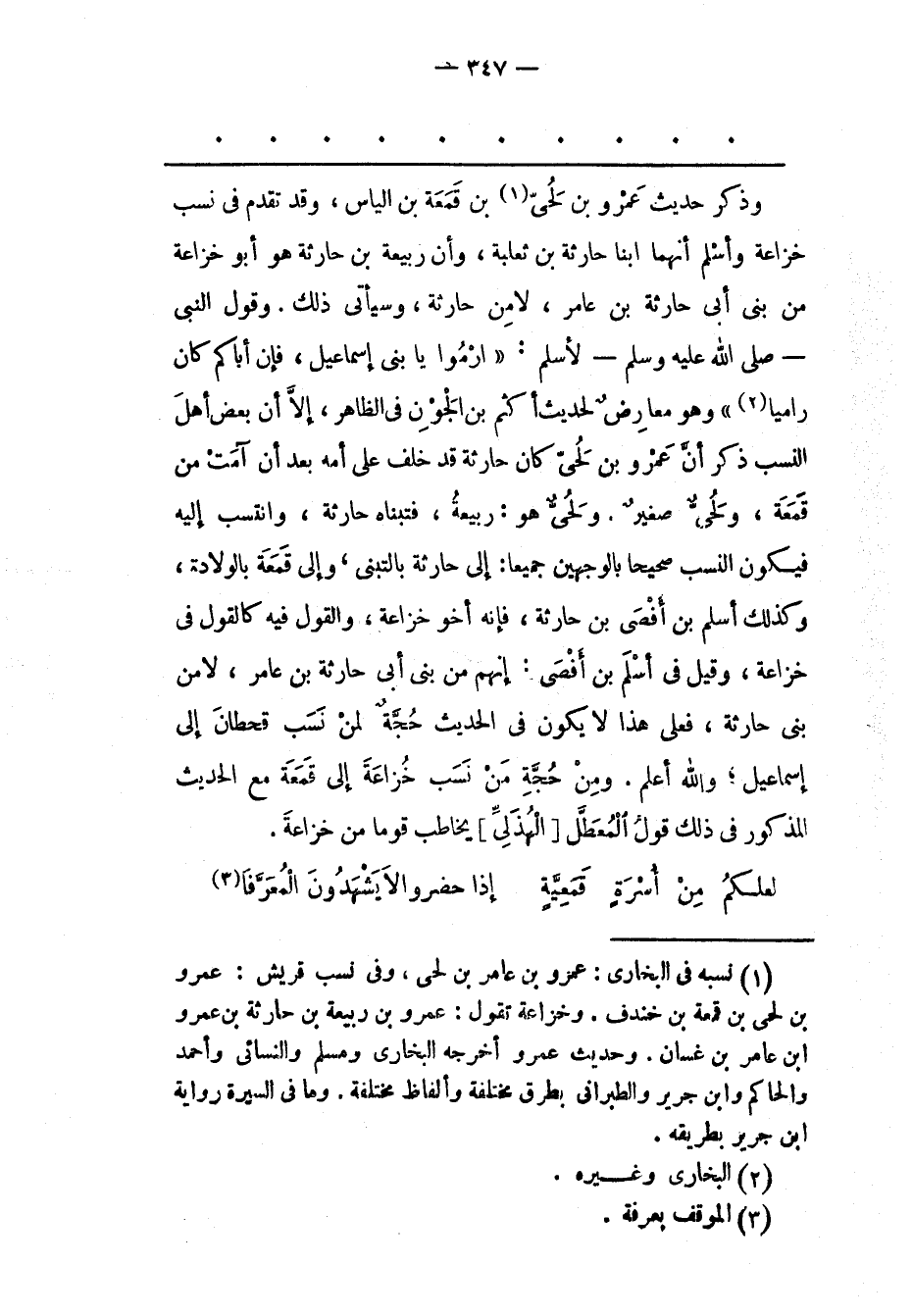 (1) نسبه فى البخارى: عمرو بن عامر بن لحى، وفى نسب قريش: عَمْرَو بْنَ لُحَيّ بْنِ قَمَعَةَ بْنِ خِنْدِفَ. وخزاعة تقول: عَمْرِو بْنِ رَبِيعَةَ بْنِ حَارِثَةَ بْنِ عَمْرِو ابن عامر بن غسان. وحديث عمرو أخرجه البخارى ومسلم والنسائى وأحمد والحاكم وابن جرير والطبرانى بطرق مختلفة وألفاظ مختلفة. وما فى السيرة رواية ابن جرير بطريقه.