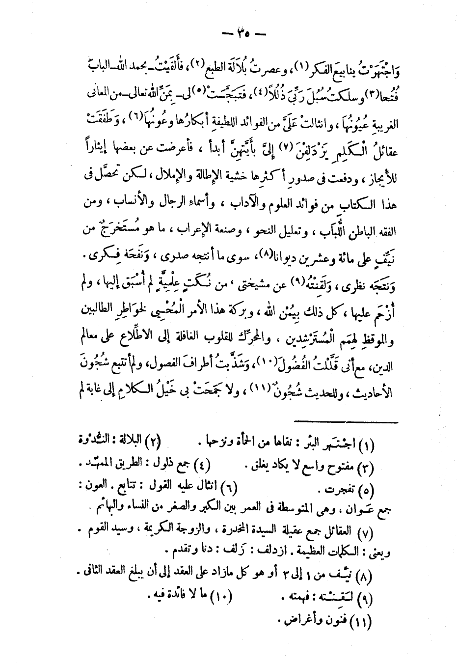 وَنَتَجَهُ نَظَرِي، وَلَقِنْته «9» عَنْ مَشْيَخَتِي، مِنْ نُكَتٍ عِلْمِيّةٍ لَمْ أُسْبَقْ إلَيْهَا، وَلَمْ أُزْحَمْ عَلَيْهَا، كُلّ ذَلِكَ بِيُمْنِ اللهِ، وَبَرَكَةِ هَذَا الْأَمْرِ الْمُحْيِي لِخَوَاطِرِ الطّالِبِينَ وَالْمُوقِظِ لِهِمَمِ الْمُسْتَرْشِدِينَ، وَالْمُحَرّكِ لِلْقُلُوبِ الْغَافِلَةِ إلَى الِاطّلَاعِ عَلَى مَعَالِمِ الدّينِ، مَعَ أَنّي قَلّلْت الْفُضُولَ «10» ، وَشَذّبْت أَطْرَافَ الْفُصُولِ، وَلَمْ أَتَتَبّعْ شُجُونَ الْأَحَادِيثِ، وَلِلْحَدِيثِ شُجُونٌ «11» ، وَلَا جَمَحَتْ بِي خَيْلُ الْكَلَامِ إلَى غَايَةٍ لم