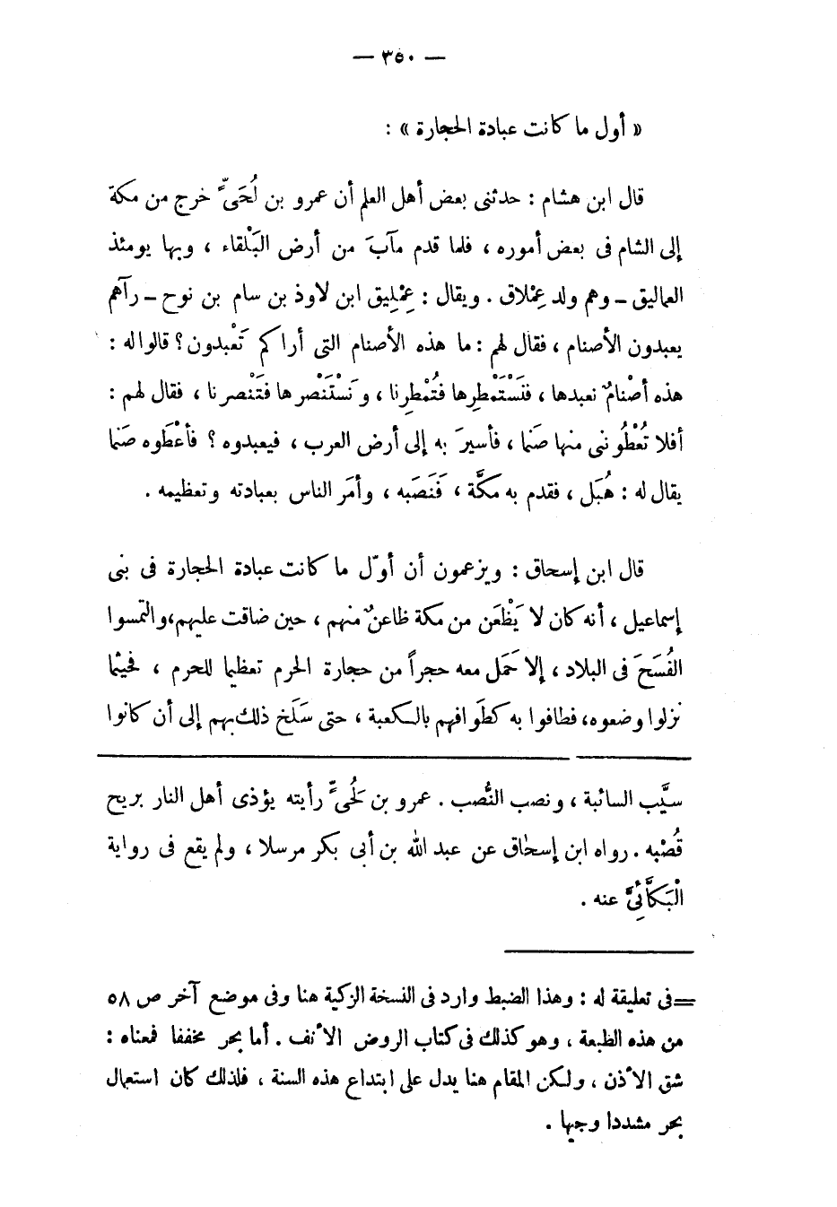 - فى تعليقة له: وهذا الضبط وارد فى النسخة الزكية هنا وفى موضع آخر ص 58 من هذه الطبعة، وهو كذلك فى كتاب الروض الأنف. أما بحر مخففا فمعناه: شق الأذن، ولكن المقام هنا يدل على ابتداع هذه السنة، فلذلك كان استعمال بحر مشددا وجيها.