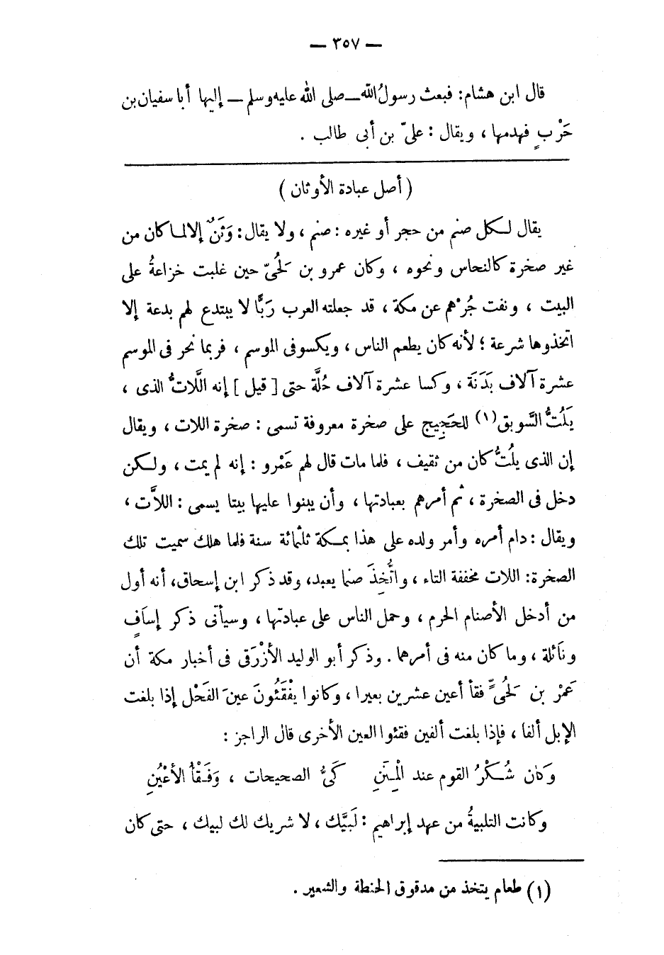 (أَصْلُ عِبَادَةِ الْأَوْثَانِ) يُقَالُ لِكُلّ صَنَمٍ مِنْ حَجَرٍ أَوْ غَيْرِهِ: صَنَمٌ، وَلَا يُقَالُ: وَثَنٌ إلّا لِمَا كَانَ مِنْ غَيْرِ صَخْرَةٍ كَالنّحَاسِ وَنَحْوِهِ، وَكَانَ عَمْرُو بْنُ لُحَيّ حِينَ غَلَبَتْ خُزَاعَةُ عَلَى الْبَيْتِ، وَنَفَتْ جُرْهُمُ عَنْ مَكّةَ، قَدْ جَعَلَتْهُ الْعَرَبُ رَبّا لَا يَبْتَدِعُ لَهُمْ بِدْعَةً إلّا اتّخَذُوهَا شِرْعَةً؛ لِأَنّهُ كَانَ يُطْعِمُ النّاسَ، وَيَكْسُو فِي الْمَوْسِمِ، فَرُبّمَا نَحَرَ فِي الْمَوْسِمِ عَشَرَةَ آلَافِ بَدَنَةٍ، وَكَسَا عَشَرَةَ آلَافِ حلّة حتى [قيل] إنه اللّاتّ الذى، يلتّ السّوبق «1» للحجيج على صخرة معروفة تسمى: صخرة اللات، وَيُقَالُ إنّ الّذِي يَلُتّ كَانَ مِنْ ثَقِيفٍ، فَلَمّا مَاتَ قَالَ لَهُمْ عَمْرٌو: إنّهُ لَمْ يَمُتْ، وَلَكِنْ دَخَلَ فِي الصّخْرَةِ، ثُمّ أَمَرَهُمْ بعبادتها، وأن يبنوا عليها بيتا يسمى: اللّات، وَيُقَالُ: دَامَ أَمْرُهُ وَأَمَرَ وَلَدَهُ عَلَى هَذَا بمكة ثلثمائة سنة فلما هلك سميت تلك الصخرة: اللات مُخَفّفَةَ التّاءِ، وَاُتّخِذَ صَنَمًا يُعْبَدُ، وَقَدْ ذَكَرَ ابْنُ إسْحَاقَ، أَنّهُ أَوّلُ مَنْ أَدْخَلَ الْأَصْنَامَ الْحَرَمَ، وَحَمَلَ النّاسَ عَلَى عِبَادَتِهَا، وَسَيَأْتِي ذِكْرُ إسَافٍ وَنَائِلَةَ، وَمَا كَانَ مِنْهُ فِي أَمْرِهِمَا. وَذَكَرَ أَبُو الْوَلِيدِ الْأَزْرَقِيّ فِي أَخْبَارِ مَكّةَ أن عمر بْنَ لُحَيّ فَقَأَ أَعْيُنِ عِشْرِينَ بَعِيرًا، وَكَانُوا يَفْقَئُونَ عَيْنَ الْفَحْلِ إذَا بَلَغَتْ الْإِبِلُ أَلْفًا، فَإِذَا بَلَغَتْ أَلْفَيْنِ فَقَئُوا الْعَيْنَ الْأُخْرَى قَالَ الرّاجِزُ:
