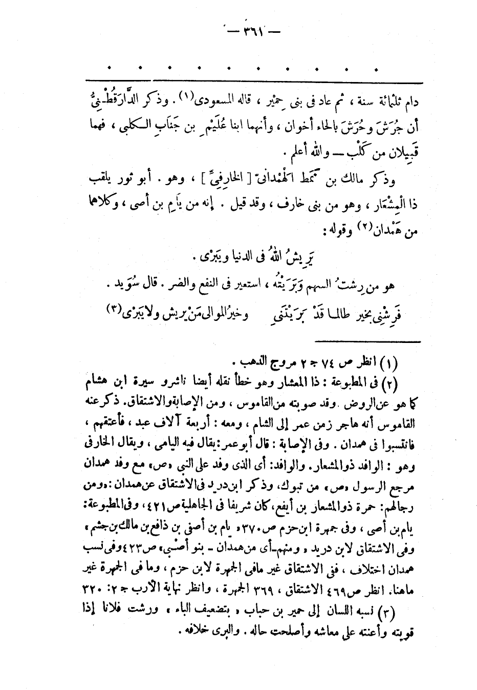 (2) فى المطبوعة: ذا المعشار وهو خطأ نقله أيضا ناشر وسيرة ابن هشام كما هو عن الروض. وقد صوبته من القاموس، ومن الإصابة والاشتقاق. ذكر عنه القاموس أنه هاجر زمن عمر إلى الشام، ومعه: أربعة آلاف عبد، فأعتقهم، فانتسبوا فى همدان. وفى الإصابة: قال أبو عمر: يقال فيه اليامى، ويقال الخارفى وهو: الوافد ذو المشعار. والوافد: أى الذى وفد على النبى «ص» مع وفد همدان مرجع الرسول «ص» من تبوك، وذكر ابن دريد فى الاشتقاق عن همدان: «ومن رجالهم: حمرة ذو المشعار بن أيفع، كان شريفا فى الجاهلية ص 421، وفى المطبوعة: يام بن أصى، وفى جمهرة ابن حزم ص 370 «يام بن أصفى بن ذافع بن مالك بن جشم» وفى الاشتقاق لابن دريد «ومنهم- أى من همدان- بنو أصبى» ص 423 وفى نسب همدان اختلاف، ففى الاشتقاق غير ما فى الجمهرة لابن حزم، وما فى الجمهرة غير ما هنا. انظر ص 469 الاشتقاق، 369 الجمهرة، وانظر نهاية الأرب ج 2: 320