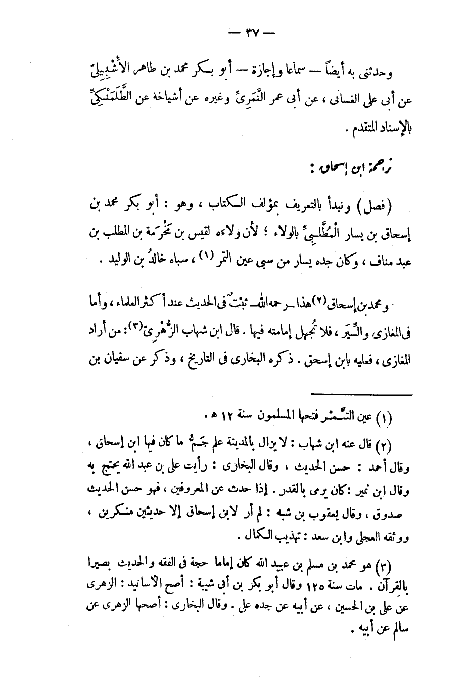 (2) قال عنه ابن شهاب: لا يزال بالمدينة علم جمّ ما كان فيها ابن إسحاق، وقال أحمد: حسن الحديث، وقال البخارى: رأيت على بن عبد الله يحتج به وقال ابن نمير: كان يرمى بالقدر. إذا حدث عن المعروفين، فهو حسن الحديث صدوق، وقال يعقوب بن شبه: لم أر لابن إسحاق إلا حديثين منكرين، ووثقه العجلى وابن سعد: تهذيب الكمال.