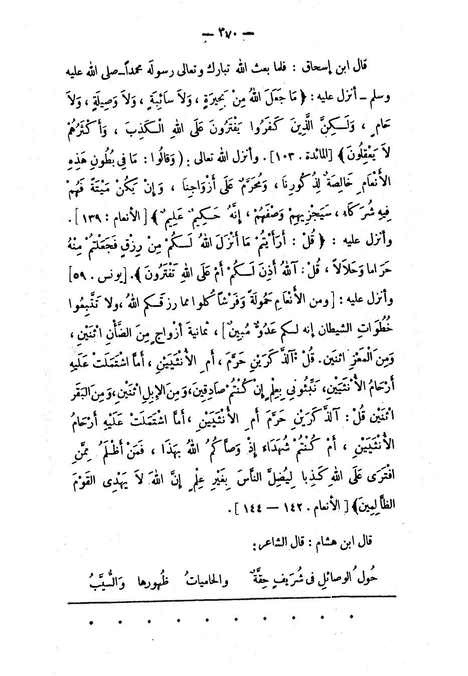 قَالَ ابْنُ إسْحَاقَ: فَلَمّا بَعَثَ اللهُ تَبَارَكَ وَتَعَالَى رَسُولَهُ مُحَمّدًا- صَلّى اللهُ عَلَيْهِ وَسَلّمَ- أَنَزَلَ عَلَيْهِ: مَا جَعَلَ اللَّهُ مِنْ بَحِيرَةٍ، وَلا سائِبَةٍ، وَلا وَصِيلَةٍ، وَلا حامٍ، وَلكِنَّ الَّذِينَ كَفَرُوا يَفْتَرُونَ عَلَى اللَّهِ الْكَذِبَ، وَأَكْثَرُهُمْ لا يَعْقِلُونَ [المائدة: 103] . وَأَنْزَلَ اللهُ تَعَالَى: (وَقالُوا: مَا فِي بُطُونِ هذِهِ الْأَنْعامِ خالِصَةٌ لِذُكُورِنا، وَمُحَرَّمٌ عَلى أَزْواجِنا، وَإِنْ يَكُنْ مَيْتَةً فَهُمْ فِيهِ شُرَكاءُ، سَيَجْزِيهِمْ وَصْفَهُمْ، إِنَّهُ حَكِيمٌ عَلِيمٌ) [الأنعام: 139] .