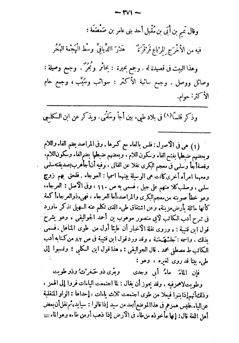 (1) هى فى الأصول: فلس بالفاء مع كسرها. وفى المراصد بضم الفاء واللام وبعضهم ضبطها بفتح الفاء وسكون اللام، وبعضهم ضبطها بضم الفاء وسكون اللام، وقصة أجأ وسلمى فى معجم البكرى نقلا عن القالى، وفيه أن أجأ هرب بصديقته سلمى ومعهما امرأه أخرى كانت هى الوسيلة بينهما اسمها: العوجاء. فلحق بهم زوج سلمى، وصلب كلا منهم على جبل، فسمى به ص 110، وفى الأصل: العرجاء، وهو خطأ صوبته من معجم البكرى والمراصد، أما العرجاء، فهى «ذو العرجاء أكمة كأنها مائلة بأرض مزينة» وعن اشتقاق طئ الذى تكلم عنه السهيلى نذكر ما ورد فى شرح أدب الكاتب لأبى منصور موهوب بن أحمد الجواليقى «وهو يشرح قول ابن قتيبة: «وروى نقلة الأخبار أن طيئا أول من طوى المناهل، فسمى بذلك، واسمه: جلهمة» وقد ورد قول ابن قتيبة فى ص 82 من كتابه أدب الكاتب ط مصطفى محمد. قال الجواليقى: «هذا قول ابن الكلبى؛ ونسبوا إلى طئ بيتا قد روى لغيره، وهو: