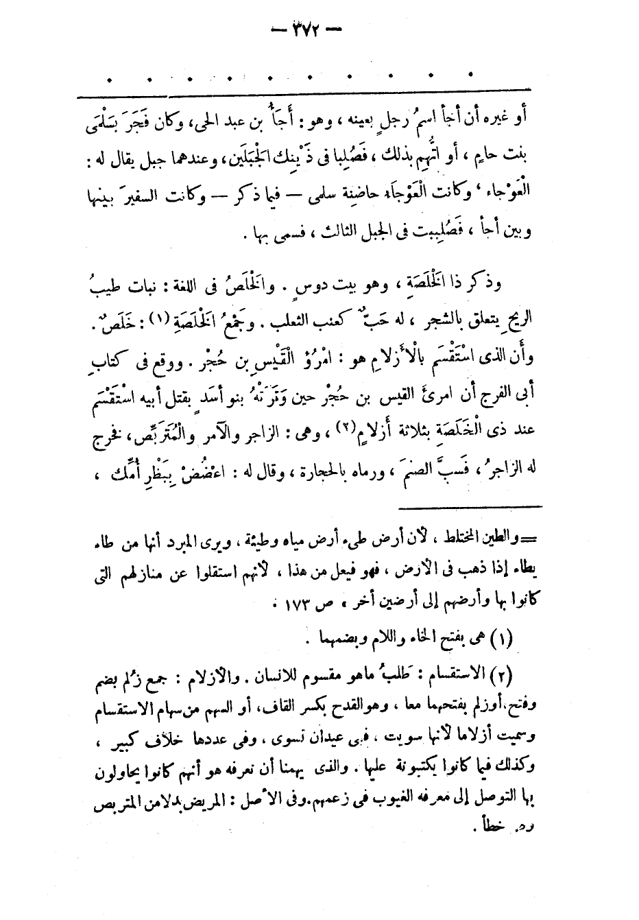 وَأَنّ الّذِي اسْتَقْسَمَ بِالْأَزْلَامِ هُوَ: امْرُؤُ الْقَيْسِ بْنُ حُجْرٍ. ووقع فى كتاب أبى الفرج أن امرئ الْقَيْسِ بْنِ حُجْرٍ حِينَ وَتَرَتْهُ بَنُو أَسَدٍ بِقَتْلِ أَبِيهِ اسْتَقْسَمَ عِنْدَ ذِي الْخَلَصَةِ بِثَلَاثَةِ أَزْلَامٍ «2» ، وَهِيَ: الزّاجِرُ وَالْآمِرُ وَالْمُتَرَبّصُ، فَخَرَجَ لَهُ الزّاجِرُ، فَسَبّ الصّنَمَ، وَرَمَاهُ بِالْحِجَارَةِ، وَقَالَ لَهُ: اعضض ببظر أمّك،