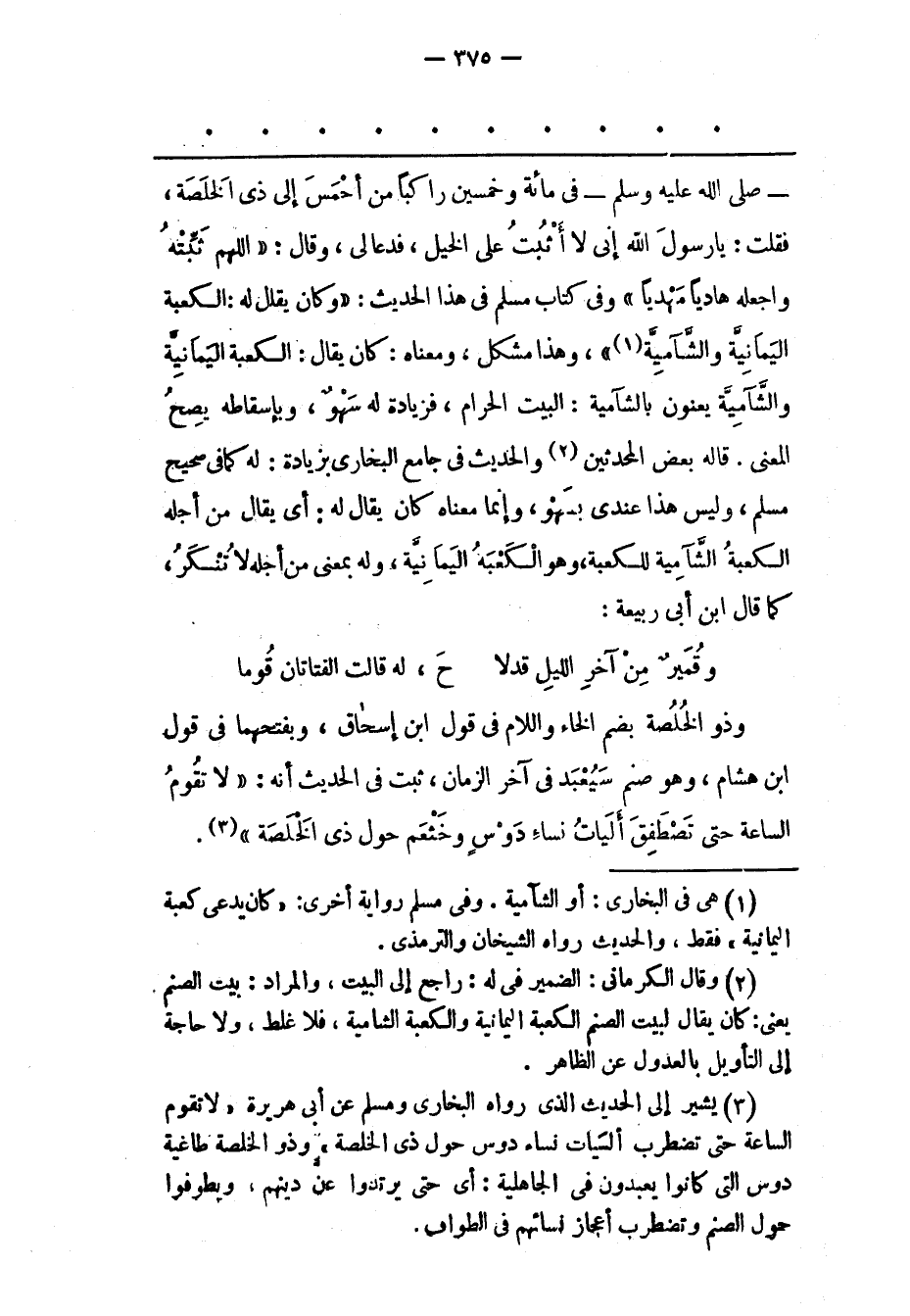 (3) يشير إلى الحديث الذى رواه البخارى ومسلم عن أبى هريرة «لا تقوم الساعة حتى تضطرب أليات نساء دوس حول ذى الخلصة» وذو الخلصة طاغية دوس التى كانوا يعبدون فى الجاهلية: أى حتى يرتدوا عن دينهم، ويطوفوا حول الصنم وتضطرب أعجاز نسائهم فى الطواف.