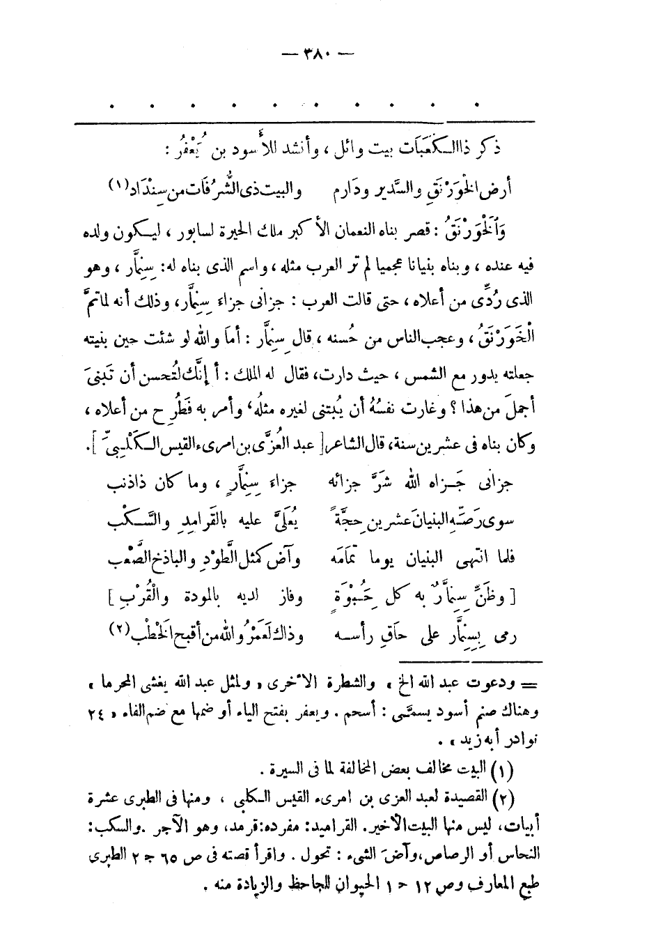(2) القصيدة لعبد العزى بن امرئ القيس الكلبى، ومنها فى الطبرى عشرة أبيات، ليس منها البيت الأخير. القراميد: مفرده: قرمد، وهو الآجر. والسكب: النحاس أو الرصاص، وآض الشئ: تحول. واقرأ قصته فى ص 65 ج 2 الطبرى طبع المعارف وص 12 ح 1 الحيوان للجاحظ والزيادة منه.