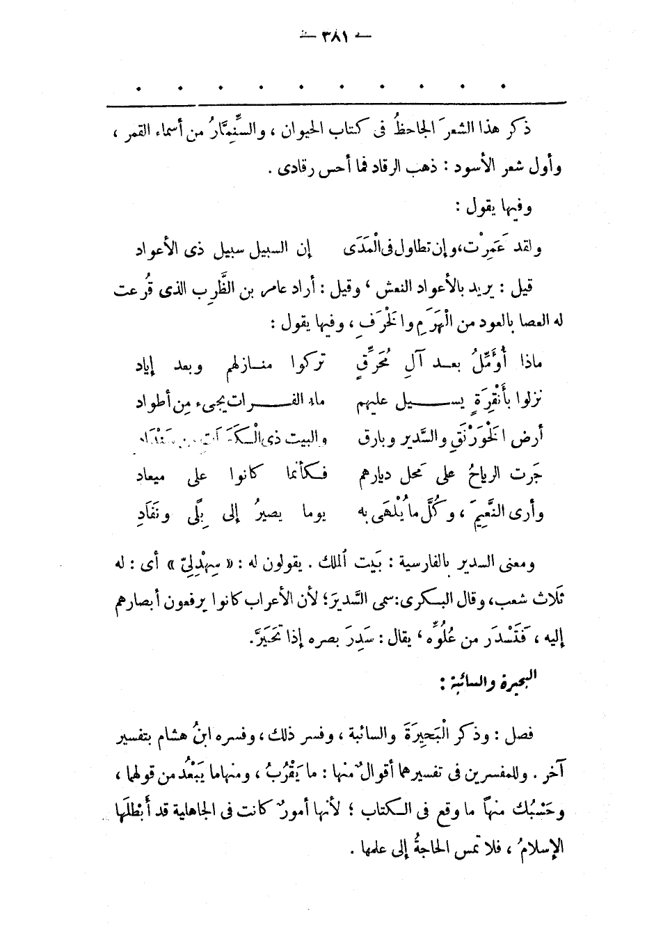فَصْلٌ: وَذَكَرَ الْبَحِيرَةَ وَالسّائِبَةَ، وَفَسّرَ ذَلِكَ، وَفَسّرَهُ ابْنُ هِشَامٍ بِتَفْسِيرِ آخَرَ. وَلِلْمُفَسّرِينَ فِي تَفْسِيرِهِمَا أَقْوَالٌ مِنْهَا: مَا يَقْرُبُ، وَمِنْهَا مَا يَبْعُدُ مِنْ قَوْلِهِمَا، وَحَسْبُك مِنْهَا مَا وَقَعَ فِي الْكِتَابِ؛ لِأَنّهَا أُمُورٌ كَانَتْ فِي الْجَاهِلِيّةِ قَدْ أَبْطَلَهَا الْإِسْلَامُ، فَلَا تَمَسّ الْحَاجَةُ إلَى عِلْمِهَا.