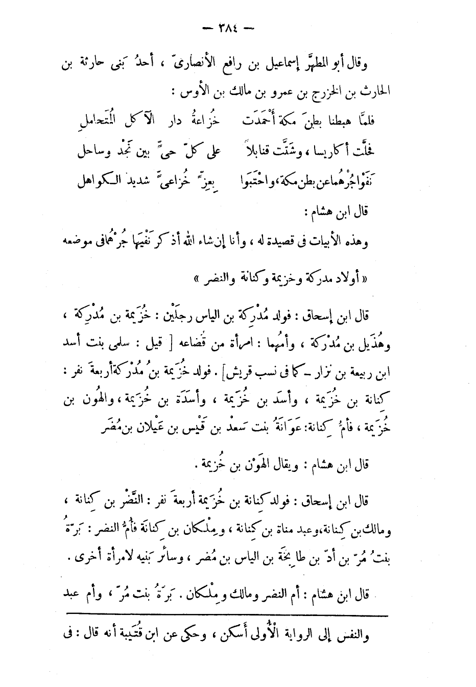 قَالَ ابْنُ إسْحَاقَ: فَوَلَدَ مُدْرِكَةُ بْنُ إلْيَاسَ رَجُلَيْنِ: خُزَيْمَةَ بْنَ مُدْرِكَةَ، وَهُذَيْلَ بْنَ مُدْرِكَةَ، وأمهما: امرأة من قضاعه [قيل: سلمى بنت أسد ابن ربيعة بن نزار- كما فى نسب قريش] . فولد خزيمة بنى مُدْرِكَةَ أَرْبَعَةَ نَفَرٍ: