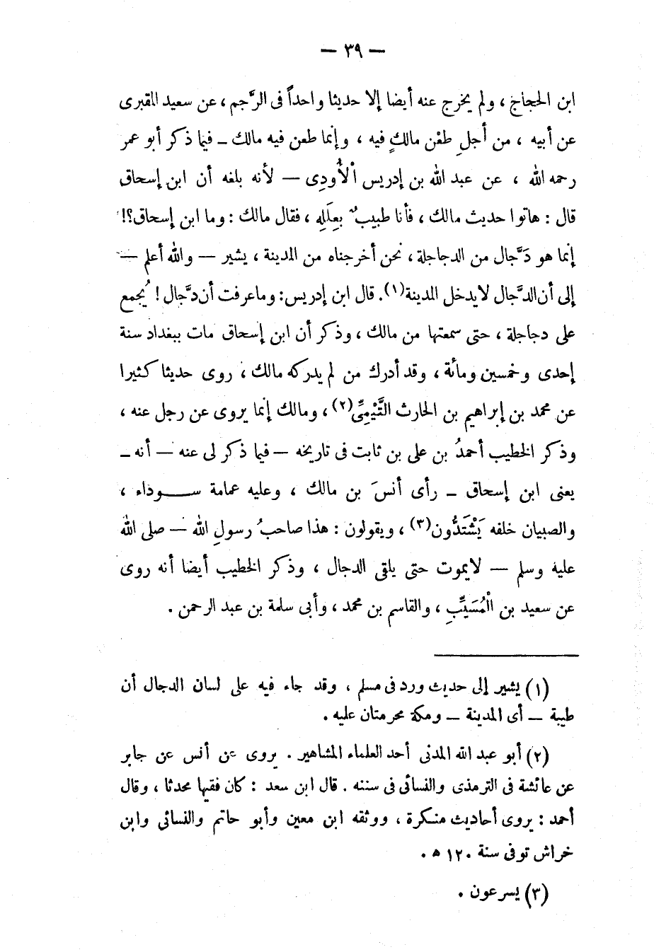 ابن الْحَجّاجِ، وَلَمْ يُخْرِجْ عَنْهُ أَيْضًا إلّا حَدِيثًا وَاحِدًا فِي الرّجْمِ، عَنْ سَعِيدٍ الْمَقْبُرِيّ عَنْ أَبِيهِ، مِنْ أَجْلِ طَعْنِ مَالِكٍ فِيهِ، وَإِنّمَا طَعَنَ فِيهِ مَالِكٌ- فِيمَا ذَكَرَ أَبُو عُمَرَ رَحِمَهُ اللهُ، عَنْ عَبْدِ اللهِ بْنِ إدْرِيسَ الْأَوْدِيّ- لِأَنّهُ بَلَغَهُ أَنّ ابْنَ إسْحَاقَ قَالَ: هَاتُوا حَدِيثَ مَالِكٍ، فَأَنَا طَبِيبٌ بِعِلَلِهِ، فَقَالَ مَالِكٌ: وَمَا ابْنُ إسْحَاقَ؟! إنّمَا هُوَ دَجّالٌ مِنْ الدّجَاجِلَةِ، نَحْنُ أَخْرَجْنَاهُ مِنْ الْمَدِينَةِ، يُشِيرُ- وَاَللهُ أَعْلَمُ- إلَى أَنّ الدّجّالَ لَا يَدْخُلُ الْمَدِينَةَ «1» . قَالَ ابْنُ إدْرِيسَ: وَمَا عَرَفْت أَنّ دّجال! يجمع على دجاجلة، حتى سمعتها من مَالِكٍ، وَذَكَرَ أَنّ ابْنَ إسْحَاقَ مَاتَ بِبَغْدَادَ سَنَةَ إحْدَى وَخَمْسِينَ وَمِائَةٍ، وَقَدْ أَدْرَكَ مَنْ لَمْ يُدْرِكْهُ مَالِكٌ، رَوَى حَدِيثًا كَثِيرًا عَنْ مُحَمّدِ بْنِ إبْرَاهِيمَ بْنِ الْحَارِثِ التّيْمِيّ «2» ، وَمَالِكٌ إنّمَا يُرْوَى عَنْ رَجُلٍ عَنْهُ، وَذَكَرَ الْخَطِيبُ أَحْمَدُ بْنُ عَلِيّ بْنِ ثَابِتٍ فِي تَارِيخِهِ- فِيمَا ذَكَرَ لِي عَنْهُ- أَنّهُ- يَعْنِي ابْنَ إسْحَاقَ- رَأَى أَنَسَ بْنَ مَالِكٍ، وَعَلَيْهِ عِمَامَةٌ سَوْدَاءُ، وَالصّبْيَانُ خَلْفَهُ يَشْتَدّونَ «3» ، وَيَقُولُونَ: هَذَا صَاحِبُ رسول الله- صلى الله عليه وسلم- لا يَمُوتُ حَتّى يَلْقَى الدّجّالَ، وَذَكَرَ الْخَطِيبُ أَيْضًا أَنّهُ رُوِيَ عَنْ سَعِيدِ بْنِ الْمُسَيّبِ، وَالْقَاسِمِ بْنِ مُحَمّدٍ، وَأَبِي سَلَمَةَ بْنِ عَبْدِ الرّحْمَنِ.