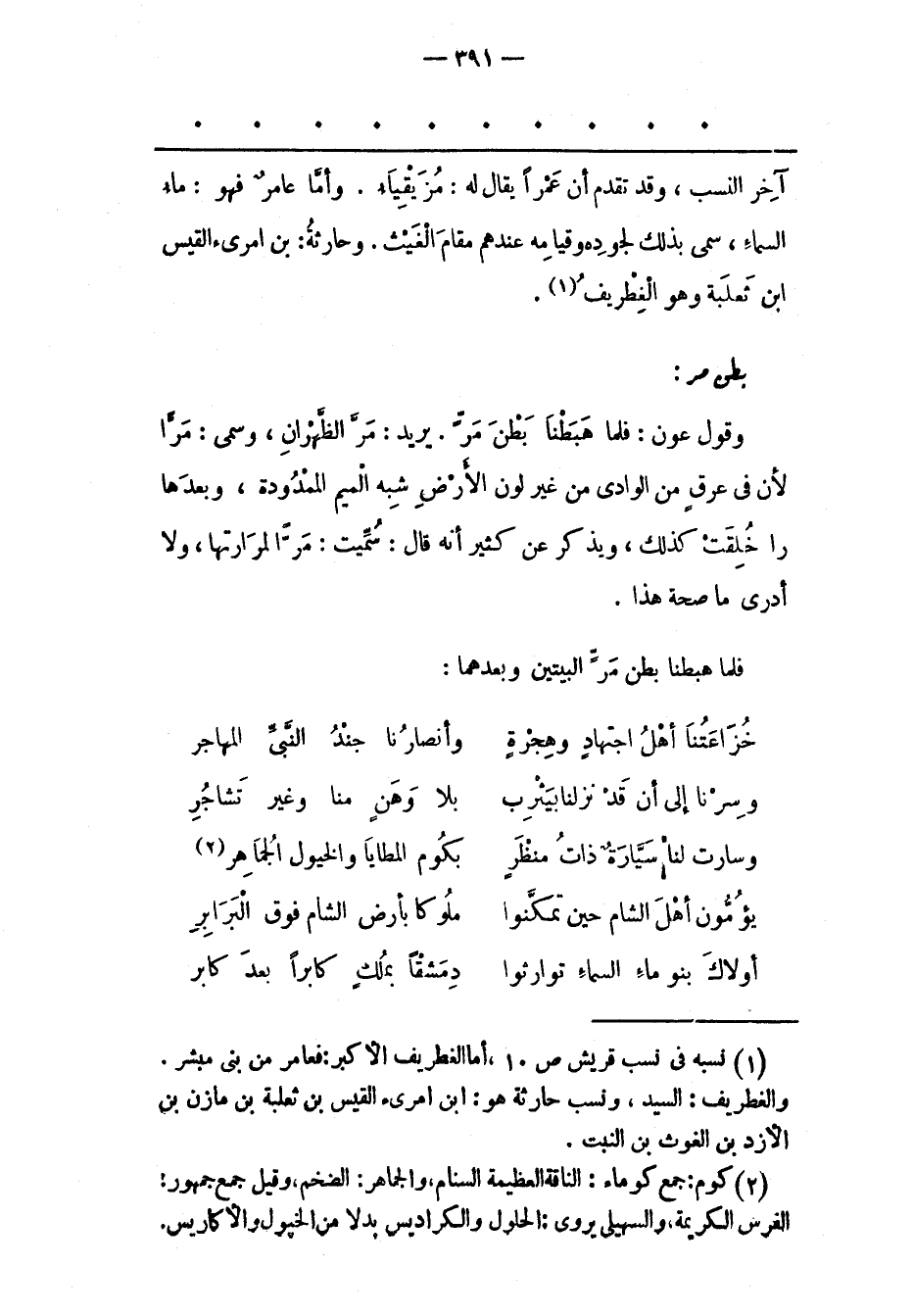 وَقَوْلُ عَوْنٍ: فَلَمّا هَبَطْنَا بَطْنَ مَرّ. يُرِيدُ: مَرّ الظّهْرَانِ، وَسُمّيَ: مَرّا لِأَنّ فِي عِرْقٍ مِنْ الْوَادِي مِنْ غَيْرِ لَوْنِ الْأَرْضِ شِبْهُ الْمِيمِ الْمَمْدُودَةِ، وَبَعْدَهَا را خُلِقَتْ كَذَلِكَ، وَيُذْكَرُ عَنْ كَثِيرٍ أَنّهُ قَالَ: سُمّيَتْ: مَرّا لِمَرَارَتِهَا، وَلَا أَدْرِي مَا صِحّةُ هَذَا.