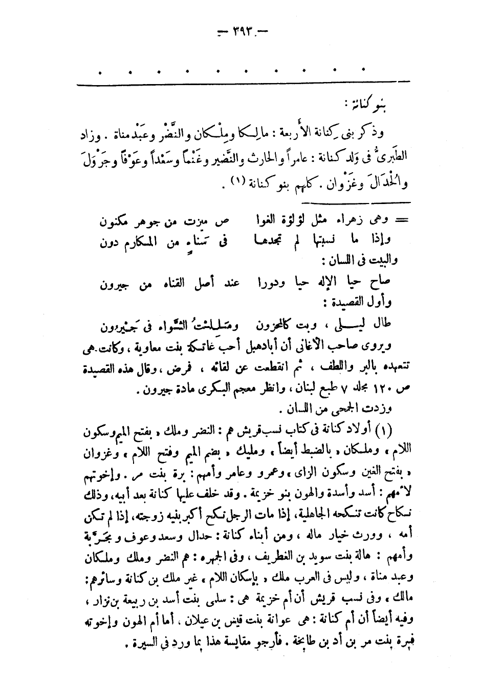 (1) أولاد كنانة فى كتاب نسب قريش هم: النضر وملك «بفتح الميم وسكون اللام» وملكان «بالضبط أيضا» ومليك «بضم الميم وفتح اللام» وغزوان «بفتح الغين وسكون الزاى» وعمرو وعامر وأمهم: برة بنت مر. وإخوتهم لأمهم: أسد وأسدة والهون بنو خزيمة. وقد خلف عليها كنانة بعد أبيه، وذلك نكاح كانت تنكحه الجاهلية، إذا مات الرجل نكح أكبر بنيه زوجته، إذا لم تكن أمه، وورث خيار ماله، ومن أبناء كنانة: حدال وسعد وعوف ومجرّبة وأمهم: هالة بنت سويد بن الغطريف، وفى الجمهره: هم النضر وملك وملكان وعبد مناة، وليس فى العرب ملك «بإسكان اللام» غير ملك بن كنانة وسائرهم: مالك» وفى نسب قريش أن أم خزيمة هى: سلمى بنت أسد بن ربيعة بن نزار، وفيه أيضا أن أم كنانة: هى عوانة بنت قيس بن عيلان، أما أم الهون وإخوته فبرة بنت مر بن أد بن طابخة. فأرجو مقايسة هذا بما ورد فى السيرة.