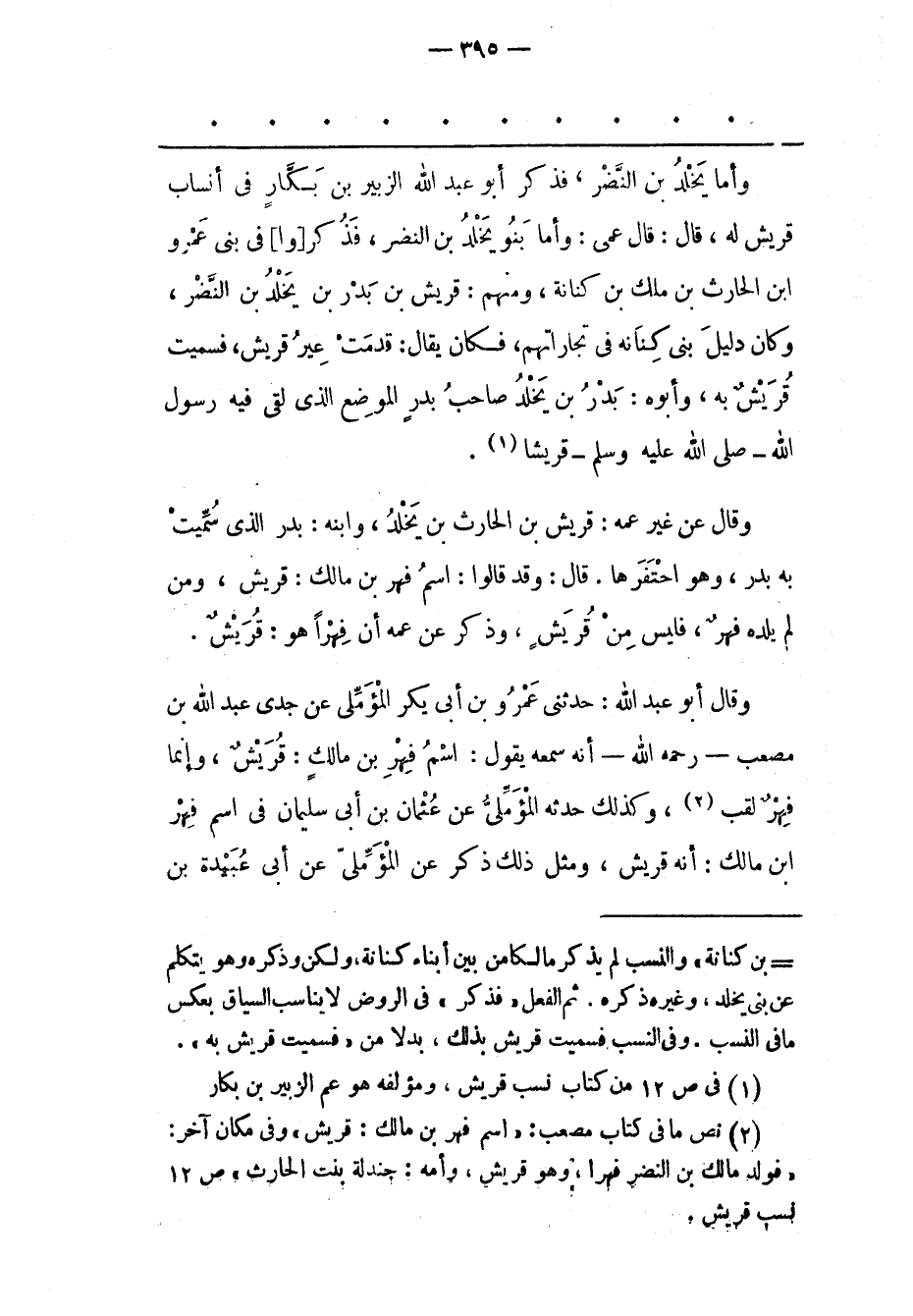 (2) نص ما فى كتاب مصعب: «اسم فهر بن مالك: قريش» وفى مكان آخر: «فولد مالك بن النضر فهرا، وهو قريش، وأمه: جندلة بنت الحارث» ص 12 نسب قريش.