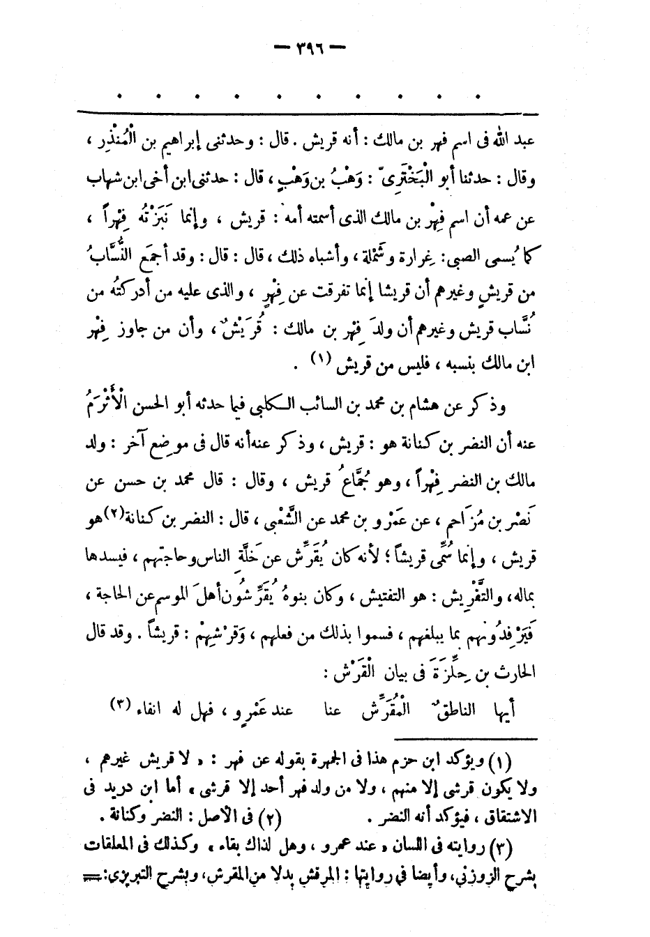 (1) ويؤكد ابن حزم هذا فى الجمهرة بقوله عن فهر: «لا قريش غيرهم، ولا يكون قرشى إلا منهم، ولا من ولد فهر أحد إلا قرشى» أما ابن دريد فى الاشتقاق، فيؤكد أنه النضر.