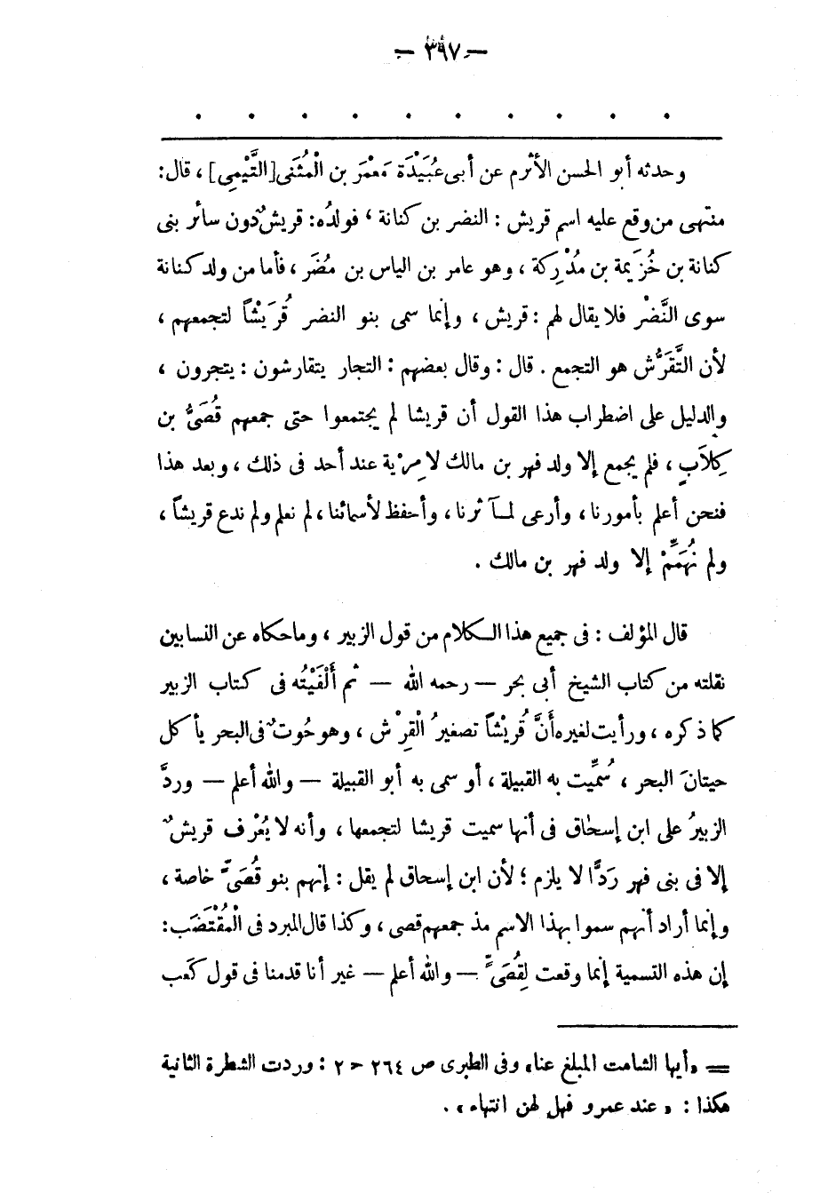 قَالَ الْمُؤَلّفُ: فِي جَمِيعِ هَذَا الْكَلَامِ مِنْ قَوْلِ الزّبَيْرِ، وَمَا حَكَاهُ عَنْ النّسّابِينَ نَقَلْته مِنْ كِتَابِ الشّيْخِ أَبِي بَحْرٍ- رَحِمَهُ اللهُ- ثُمّ أَلْفَيْته فِي كِتَابِ الزّبَيْرِ كَمَا ذَكَرَهُ، وَرَأَيْت لِغَيْرِهِ أَنّ قُرَيْشًا تَصْغِيرُ الْقِرْشِ، وَهُوَ حُوتٌ فِي الْبَحْرِ يَأْكُلُ حِيتَانَ الْبَحْرِ، سُمّيَتْ بِهِ الْقَبِيلَةُ، أَوْ سُمّيَ بِهِ أَبُو الْقَبِيلَةِ- وَاَللهُ أَعْلَمُ- وَرَدّ الزّبَيْرُ عَلَى ابْنِ إسْحَاقَ فِي أَنّهَا سُمّيَتْ قُرَيْشًا لِتَجَمّعِهَا، وَأَنّهُ لَا يُعْرَفُ قُرَيْشٌ إلّا فِي بَنِي فِهْرٍ رَدّا لَا يُلْزِمُ؛ لِأَنّ ابْنَ إسْحَاقَ لَمْ يَقُلْ: إنّهُمْ بَنُو قُصَيّ خَاصّةً، وَإِنّمَا أَرَادَ أَنّهُمْ سُمّوا بِهَذَا الِاسْمِ مذجمعهم قصى، وكذا قال المبرد فى المقتصب: