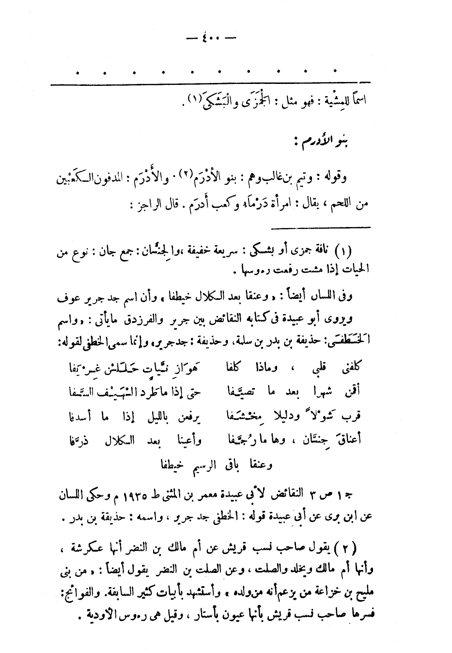 (1) ناقة جمزى أو بشكى: سريعة خفيفة، والجنّان: جمع جان: نوع من الحيات إذا مشت رفعت رءوسها. وفى اللسان أيضا: «وعنقا بعد الكلال خيطفا» وأن اسم جد جرير عوف ويروى أبو عبيدة فى كتابه النقائض بين جرير والفرزدق ما يأتى: «وَاسْمُ الْخَطَفِيّ: حُذَيْفَةُ بْنُ بَدْرِ بْنِ سَلَمَةَ، وحذيفة: جد جرير» وإنما سمى الخطفى لقوله:
