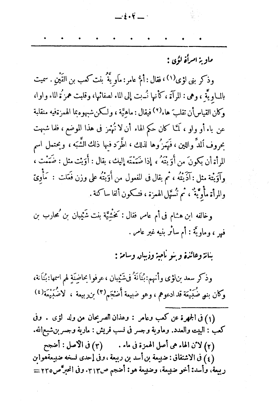 (1) فى الجمهرة عن كعب وعامر: وهذان الصريحان من ولد لؤى. وفى كعب: البيت والعدد. وماوية وجسر فى نسب قريش: مارية وجسر بن شيع الله.