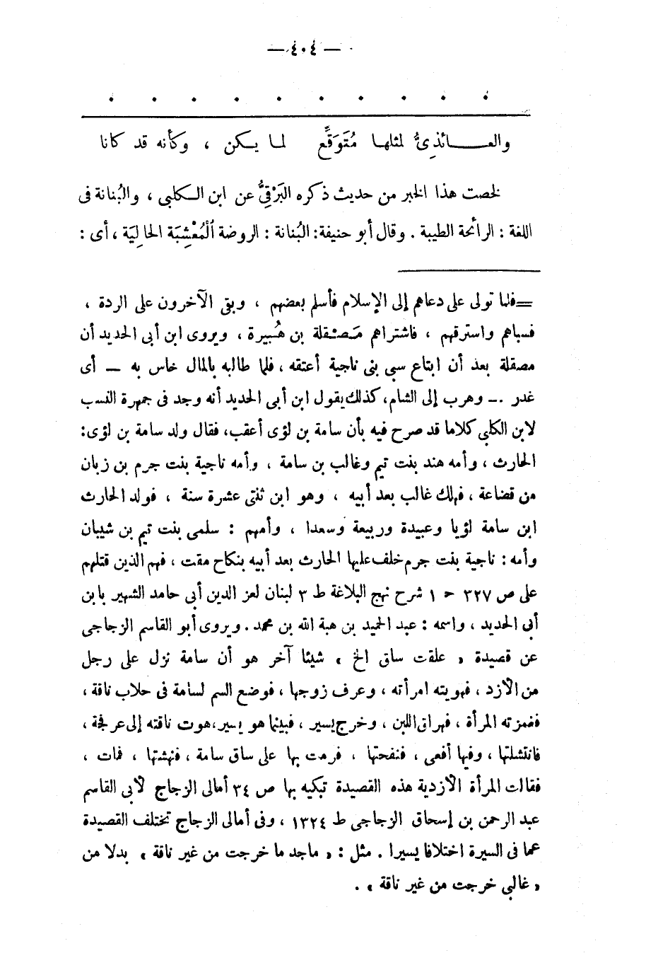 - فلما تولى على دعاهم إلى الإسلام فأسلم بعضهم، وبقى الآخرون على الردة، فسباهم واسترقهم، فاشتراهم مصقلة بن هبيرة، ويروى ابن أبى الحديد أن مصقلة بعد أن ابتاع سبى بنى ناجية أعتقه، فلما طالبه بالمال خاس به- أى غدر- وهرب إلى الشام، كذلك يقول ابن أبى الحديد أنه وجد فى جمهرة النسب لابن الكلبى كلاما قد صرح فيه بأن سامة بن لؤى أعقب، فقال ولد سامة بن لؤى: الحارث، وأمه هند بنت تيم وغالب بن سامة، وأمه ناجية بنت جرم بن زبان من قضاعة، فهلك غالب بعد أبيه، وهو ابن ثنتى عشرة سنة، فولد الحارث ابن سامة لؤيا وعبيدة وربيعة وسعدا، وأمهم: سلمى بنت تيم بن شيبان وأمه: ناجية بنت جرم خلف عليها الحارث بعد أبيه بنكاح مقت، فهم الذين قتلهم على ص 327 ح 1 شرح نهج البلاغة ط 3 لبنان لعز الدين أبى حامد الشهير بابن أبى الحديد، واسمه: عبد الحميد بن هبة الله بن محمد. ويروى أبو القاسم الزجاجى عن قصيدة «علقت ساق الخ» شيئا آخر هو أن سامة نزل على رجل من الأزد، فهويته امرأته، وعرف زوجها، فوضع السم لسامة فى حلاب ناقة، فغمزته المرأة، فهراق اللبن، وخرج يسير، فبينما هو يسير، هوت ناقته إلى عرفجة، فانتشلتها، وفيها أفعى، فنفحتها، فرمت بها على ساق سامة، فنهشتها، فمات، فقالت المرأة الأزدية هذه القصيدة تبكيه بها ص 34 أمالى الزجاج لأبى القاسم عبد الرحمن بن إسحاق الزجاجى ط 1324، وفى أمالى الزجاج تختلف القصيدة عما فى السيرة اختلافا يسيرا. مثل: «ما جد ما خرجت من غير ناقة» بدلا من «غالبى خرجت من غير ناقة» .