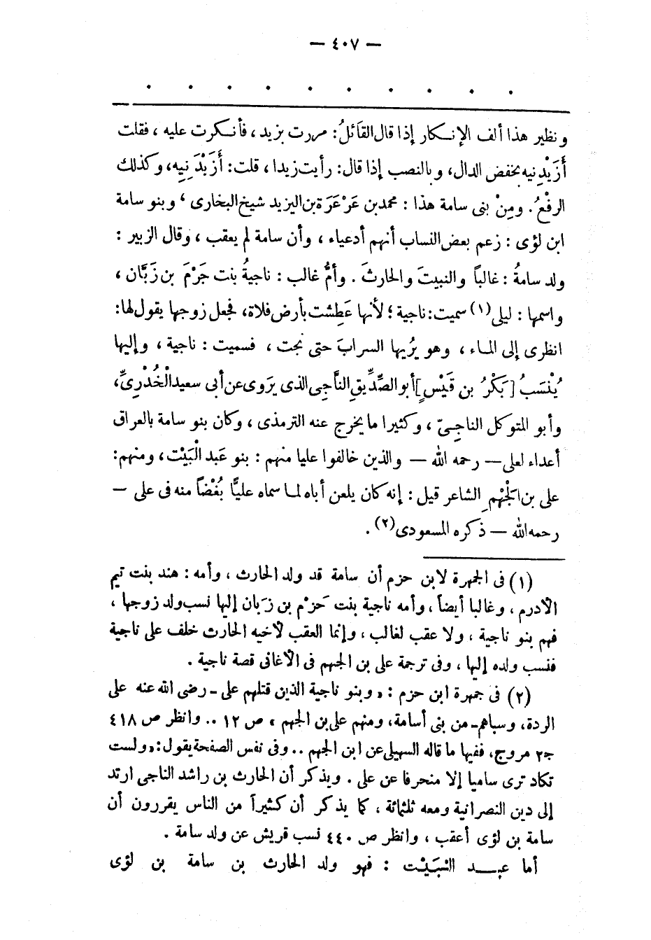 (2) فى جمهرة ابن حزم: «وبنو ناجية الذين قتلهم على- رضى الله عنه على الردة، وسباهم- من بنى أسامة، ومنهم على بن الجهم» ص 12.. وانظر ص 418 ج 2 مروج، ففيها ما قاله السهيلى عن ابن الجهم.. وفى نفس الصفحة يقول: «ولست تكاد ترى ساميا إلا منحرفا عن على. ويذكر أن الحارث بن راشد الناجى ارتد إلى دين النصرانية ومعه ثلثمائة، كما يذكر أن كثيرا من الناس يقررون أن سامة بن لؤى أعقب، وانظر ص 440 نسب قريش عن ولد سامة. أما عبد البيت: فهو ولد الحارث بن سامة بن لؤى