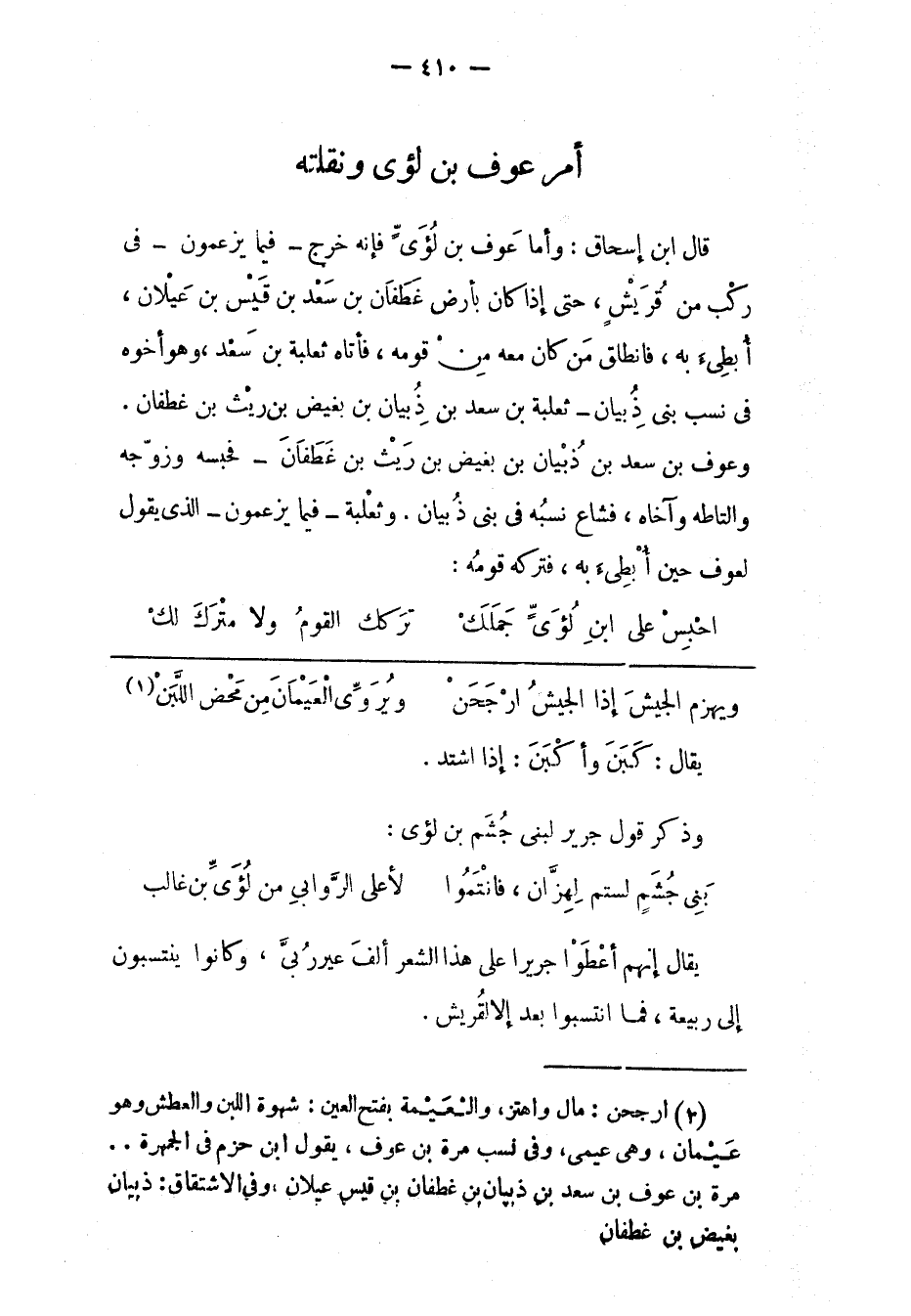 (1) ارجحن: مال واهتز، والعيمة بفتح العين: شهوة اللبن والعطش وهو عيمان، وهى عيمى، وفى نسب مرة بن عوف، يقول ابن حزم فى الجمهرة.. مُرّةُ بْنُ عَوْفِ بْنِ سَعْدِ بْنِ ذُبْيَانَ بن غطفان بن قيس عيلان، وفى الاشتقاق: ذبيان بغيض بن غطفان