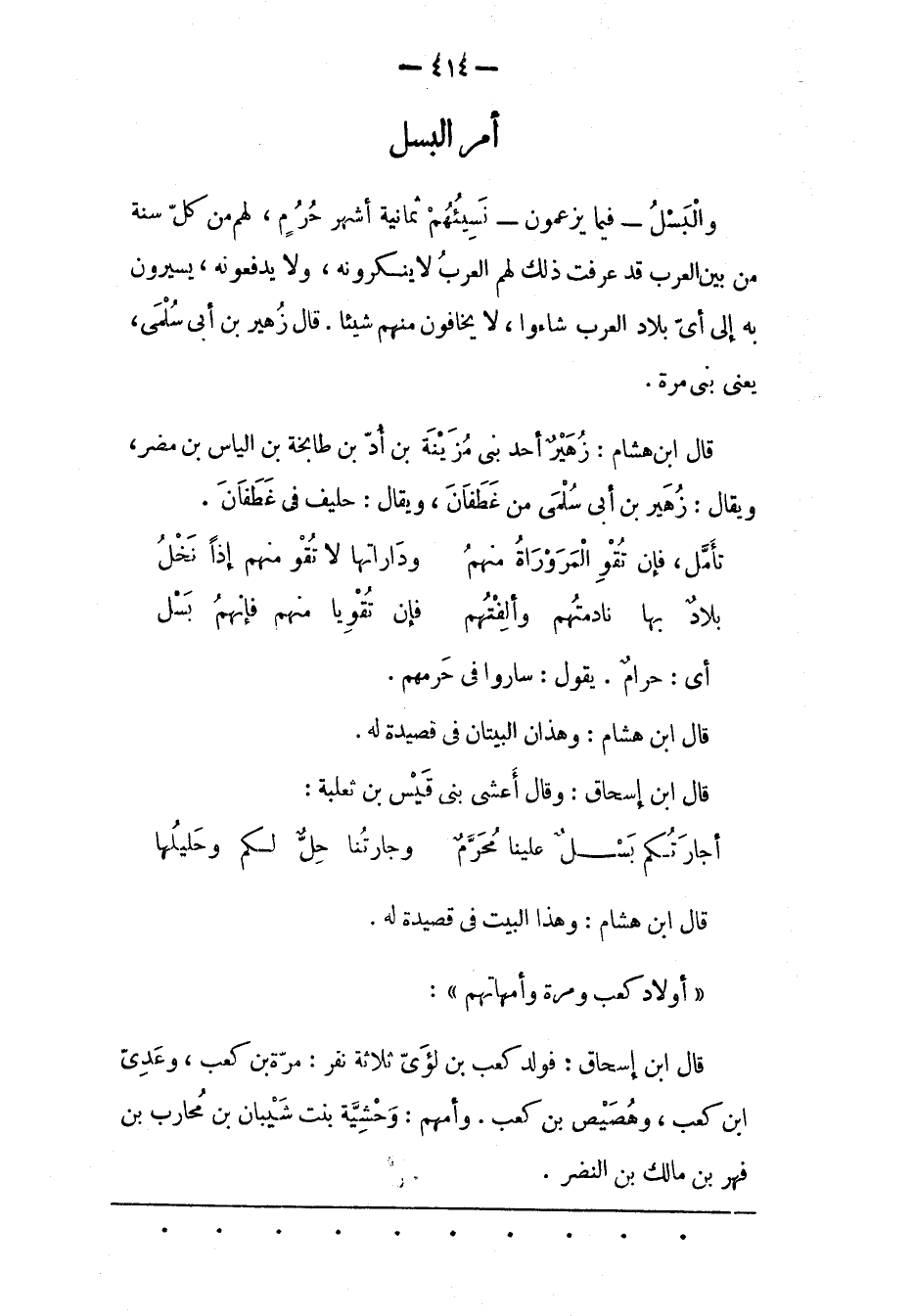 والبسل- فيما يزعمون- نسيئهم ثَمَانِيَةُ أَشْهُرٍ حُرُمٍ، لَهُمْ مِنْ كُلّ سَنَةٍ مِنْ بَيْنِ الْعَرَبِ قَدْ عَرَفَتْ ذَلِكَ لَهُمْ الْعَرَبُ لَا يُنْكِرُونَهُ، وَلَا يَدْفَعُونَهُ، يَسِيرُونَ بِهِ إلى أىّ بلاد العرب شاءوا، ولا يَخَافُونَ مِنْهُمْ شَيْئًا. قَالَ زُهَيْرُ بْنُ أَبِي سُلْمَى، يَعْنِي بَنِي مُرّةَ.