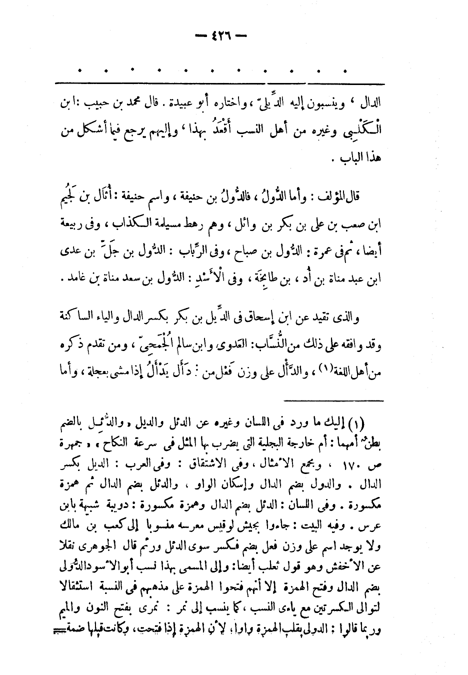 لدال، وَيَنْسُبُونَ إلَيْهِ الدّيلِيّ، وَاخْتَارَهُ أَبُو عُبَيْدَةَ. قَالَ محمد بن حبيب: ابن لكلبى وَغَيْرُهُ مِنْ أَهْلِ النّسَبِ أَقْعَدُ بِهَذَا، وَإِلَيْهِمْ يُرْجَعُ فِيمَا أَشْكَلَ مِنْ هَذَا الْبَابِ.