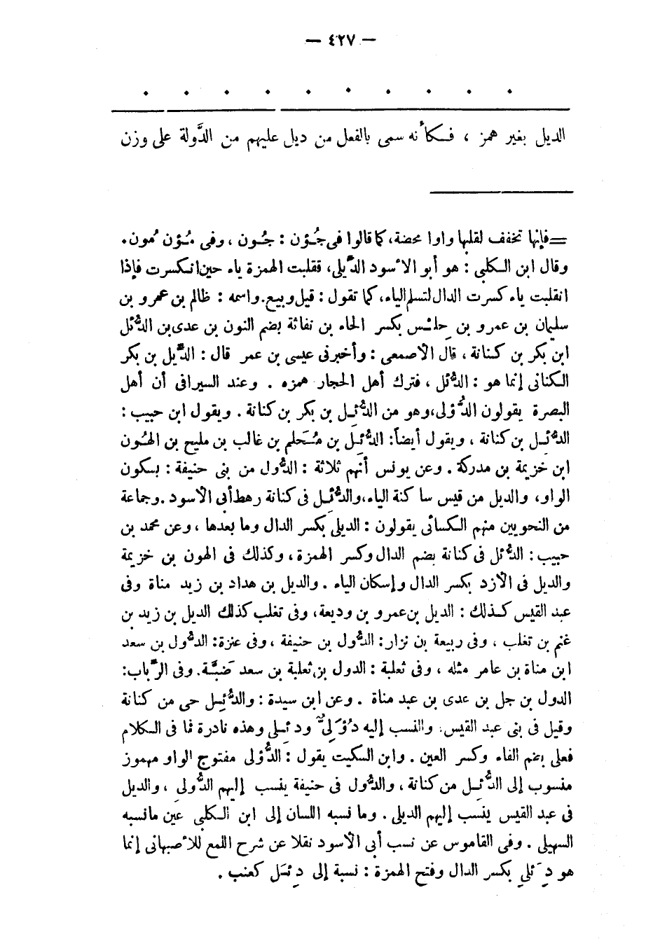- فإنها تخفف لقلبها واوا محضة، كما قالوا فى جؤن: جون، وفى مؤن مون. وقال ابن الكلبى: هو أبو الأسود الدّيلى، فقلبت الهمزة ياء حين انكسرت فإذا انقلبت ياء كسرت الدال لتسلم الياء، كما تقول: قيل وبيع. واسمه: ظالم بن عمرو بن سليمان بن عمرو بن حلس بكسر الحاء بن نفاثة بضم النون بن عدى بن الدّئل ابن بكر بن كنانة، قال الأصمعى: وأخبرنى عيسى بن عمر قال: الدّيل بن بكر الكنانى إنما هو: الدّئل، فترك أهل الحجاز همزه. وعند السيرافى أن أهل البصرة يقولون الدّؤلى، وهو من الدّئل بن بكر بن كنانة. ويقول ابن حبيب: الدّئل بن كنانة، ويقول أيضا: الدّئل بن محلم بن غالب بن مليح بن الهون ابن خزيمة بن مدركة. وعن يونس أنهم ثلاثة: الدّول من بنى حنيفة: بسكون الواو، والديل من قيس ساكنة الياء، والدّئل فى كنانة رهط أبى الأسود. وجماعة من النحويين منهم الكسائى يقولون: الديلى بكسر الدال وما بعدها، وعن محمد بن حبيب: الدّئل فى كنانة بضم الدال وكسر الهمزة، وكذلك فى الهون بن خزيمة والديل فى الأزد بكسر الدال وإسكان الياء. والديل بن هداد بن زيد مناة وفى عبد القيس كذلك: الديل بن عمرو بن وديعة، وفى تغلب كذلك الديل بن زيد بن غنم بن تغلب، وفى ربيعة بن نزار: الدّول بن حنيفة، وفى عنزة: الدّول بن سعد ابن مناة بن عامر مثله، وفى ثعلبة: الدول بن ثعلبة بن سعد ضبّة. وفى الرّباب: الدول بن جل بن عدى بن عبد مناة. وعن ابن سيدة: والدّئل حى من كنانة وقيل فى بنى عبد القيس، والنسب إليه دؤلىّ ودئلى وهذه نادرة فما فى الكلام فعلى بضم الفاء وكسر العين. وابن السكيت يقول: الدّؤلى مفتوج الواو مهموز منسوب إلى الدّئل من كنانة، والدّول فى حنيفة ينسب إليهم الدّولى، والديل فى عبد القيس ينسب إليهم الديلى. وما نسبه اللسان إلى ابن الكلبى عين ما نسبه السهيلى. وفى القاموس عن نسب أبى الأسود نقلا عن شرح اللمع للأصبهانى إنما هود ئلى بكسر الدال وفتح الهمزة: نسبة إلى دئل كعنب.