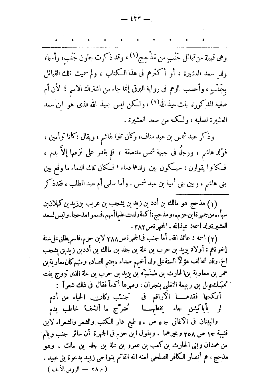 (1) مذحج هو مالك بن أدد بن زيد بن يشجب بْنِ عَرِيبِ بْنِ زَيْدِ بْنِ كُهْلَانَ بْنِ سبأ. «من جمهرة ابن حزم» ، ومذحج: أكمة ولدت عليها أمهم، فسموا مذحجا، وليس لسعد العشيرة ولد اسمه: عيذ الله. الجمهرة ص 383.